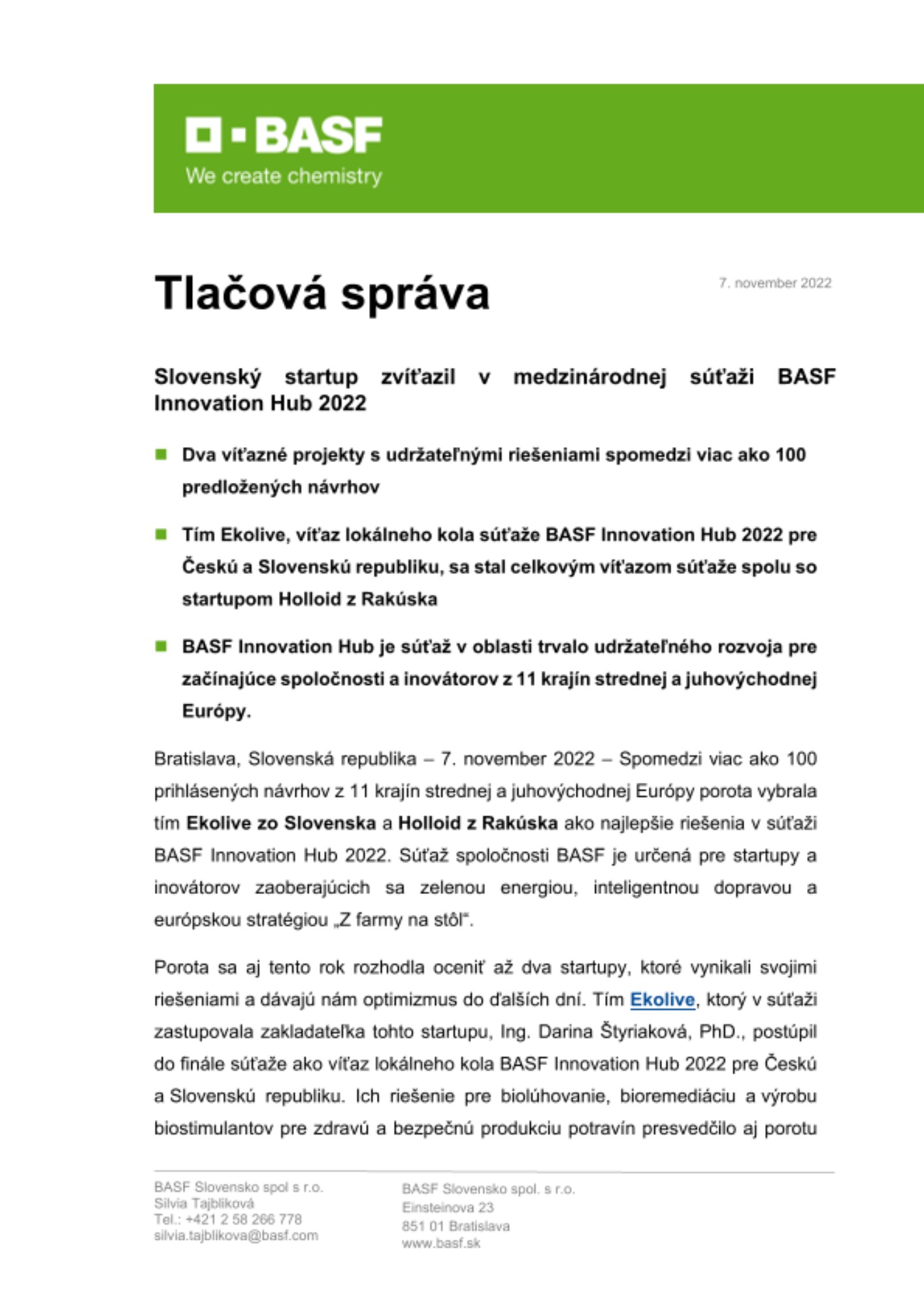 - Tím Ekolive, víťaz lokálneho kola súťaže BASF Innovation Hub 2022 pre Českú a Slovenskú republiku, sa stal celkovým víťazom súťaže spolu so startupom Holloid z Rakúska
