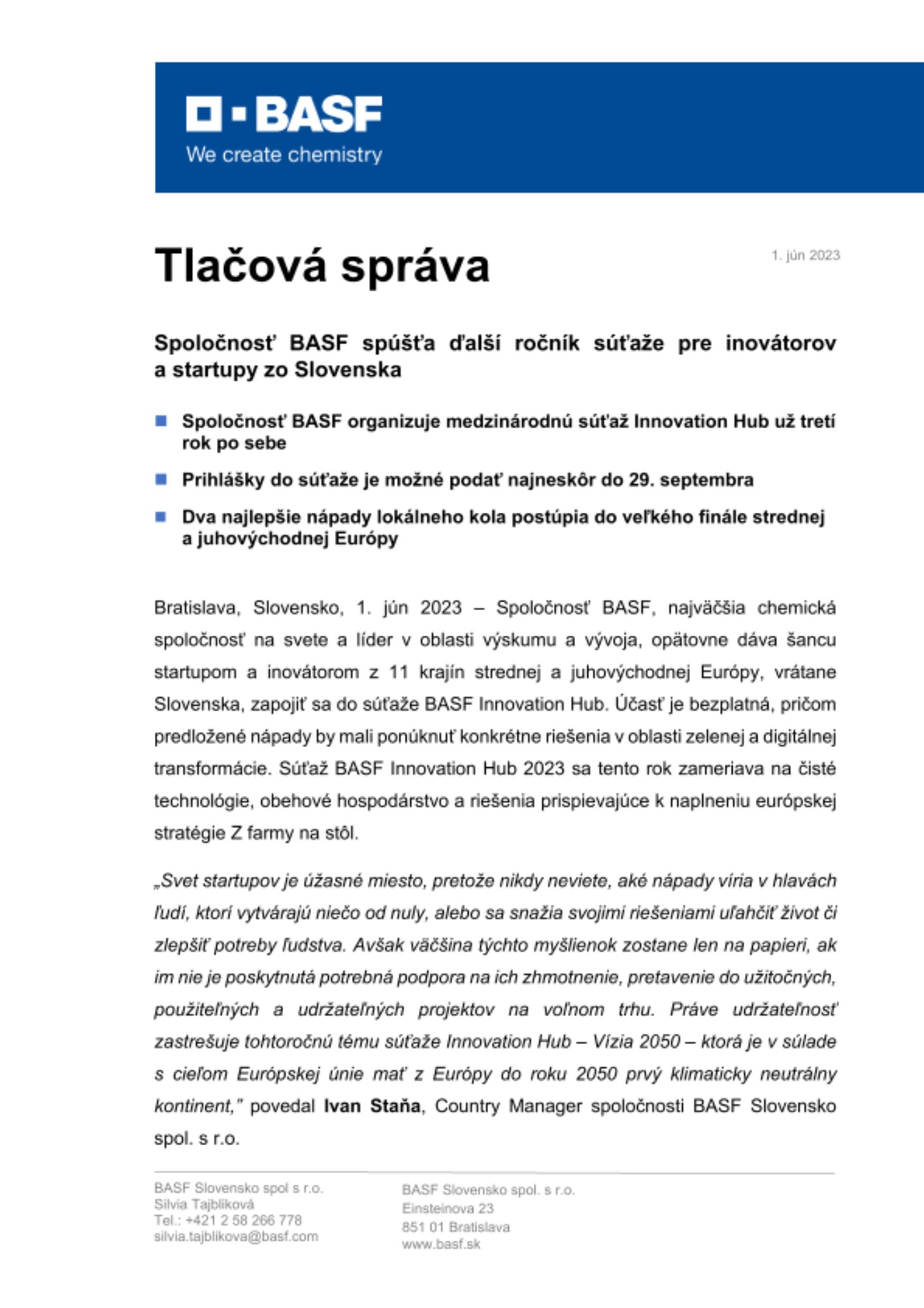 Bratislava, Slovensko, 1. jún 2023 – Spoločnosť BASF, najväčšia chemická spoločnosť na svete a líder v oblasti výskumu a vývoja, opätovne dáva šancu startupom a inovátorom z 11 krajín strednej a juhovýchodnej Európy, vrátane Slovenska, zapojiť sa do súťaže BASF Innovation Hub. Účasť je bezplatná, pričom predložené nápady by mali ponúknuť konkrétne riešenia v oblasti zelenej a digitálnej transformácie. Súťaž BASF Innovation Hub 2023 sa tento rok zameriava na čisté technológie, obehové hospodárstvo a riešenia prispievajúce k naplneniu európskej  stratégie Z farmy na stôl.