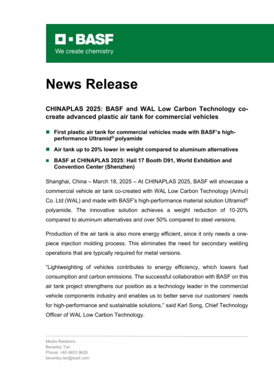 CHINAPLAS 2025: BASF and WAL Low Carbon Technology co-create advanced plastic air tank for commercial vehicles