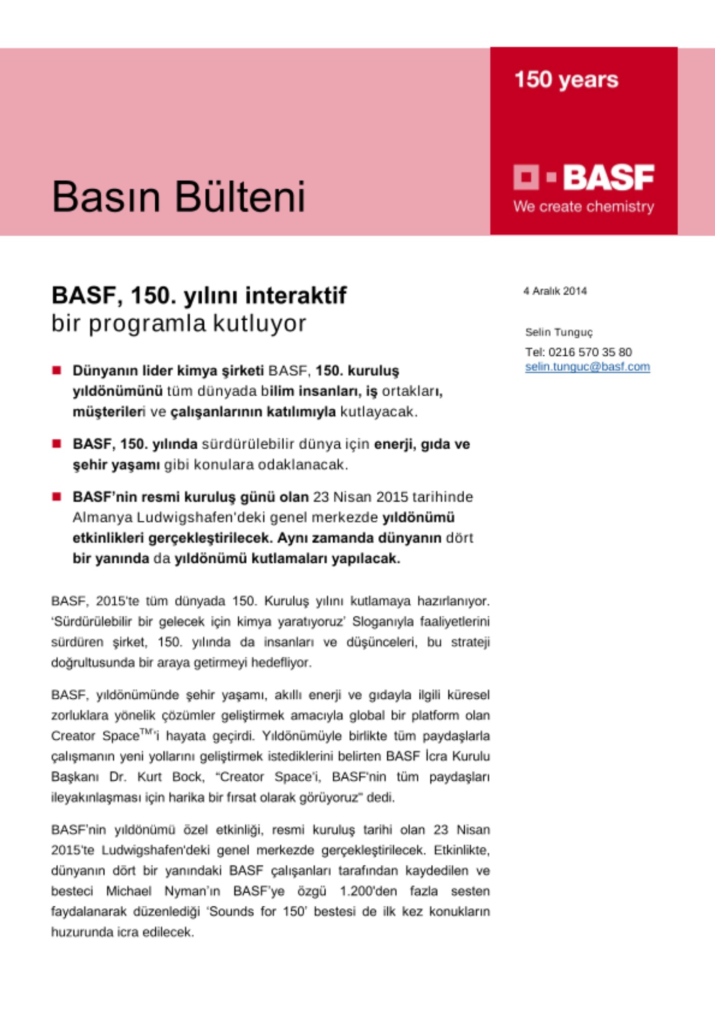 - Dünyanın lider kimya şirketi BASF, 150. kuruluş yıldönümünü tüm dünyada bilim insanları, iş ortakları, müşterileri ve çalışanlarının katılımıyla kutlayacak.