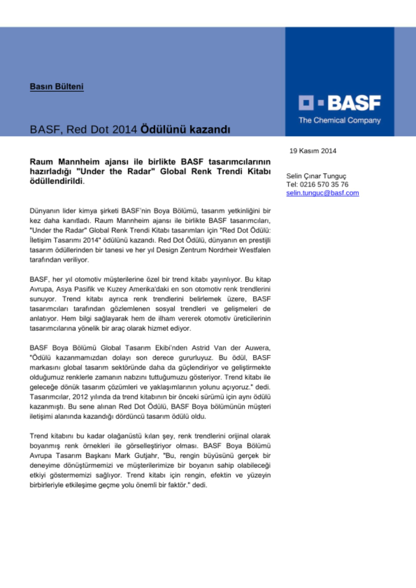 Dünyanın lider kimya şirketi BASF’nin Boya Bölümü, tasarım yetkinliğini bir kez daha kanıtladı. Raum Mannheim ajansı ile birlikte BASF tasarımcıları, "Under the Radar" Global Renk Trendi Kitabı tasarımları için "Red Dot Ödülü: İletişim Tasarımı 2014" ödülünü kazandı. Red Dot Ödülü, dünyanın en prestijli tasarım ödüllerinden bir tanesi ve her yıl Design Zentrum Nordrheir Westfalen tarafından veriliyor.