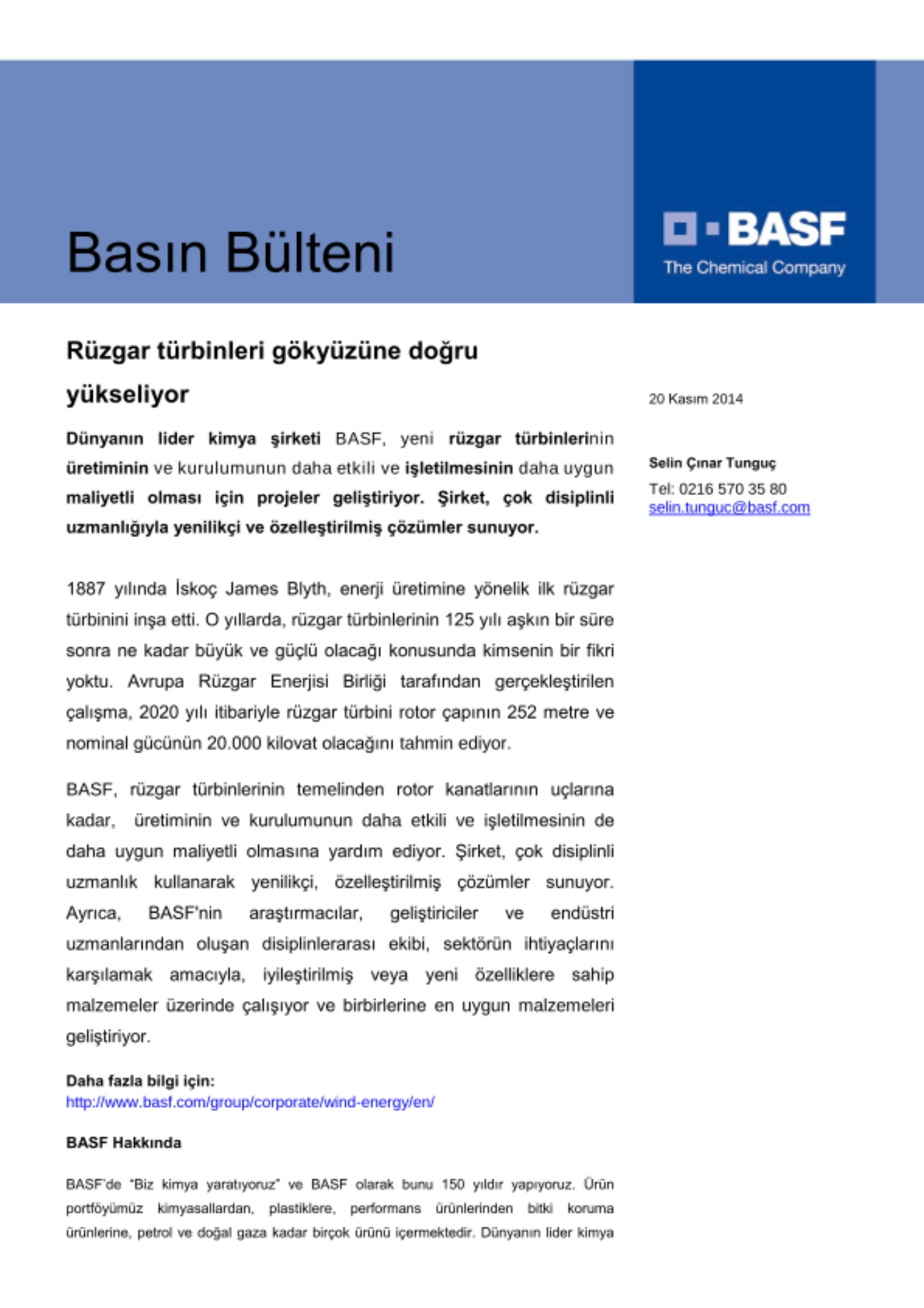 Dünyanın lider kimya şirketi BASF, yeni rüzgar türbinlerinin üretiminin ve kurulumunun daha etkili ve işletilmesinin daha uygun maliyetli olması için projeler geliştiriyor. Şirket, çok disiplinli uzmanlığıyla yenilikçi ve özelleştirilmiş çözümler sunuyor.
