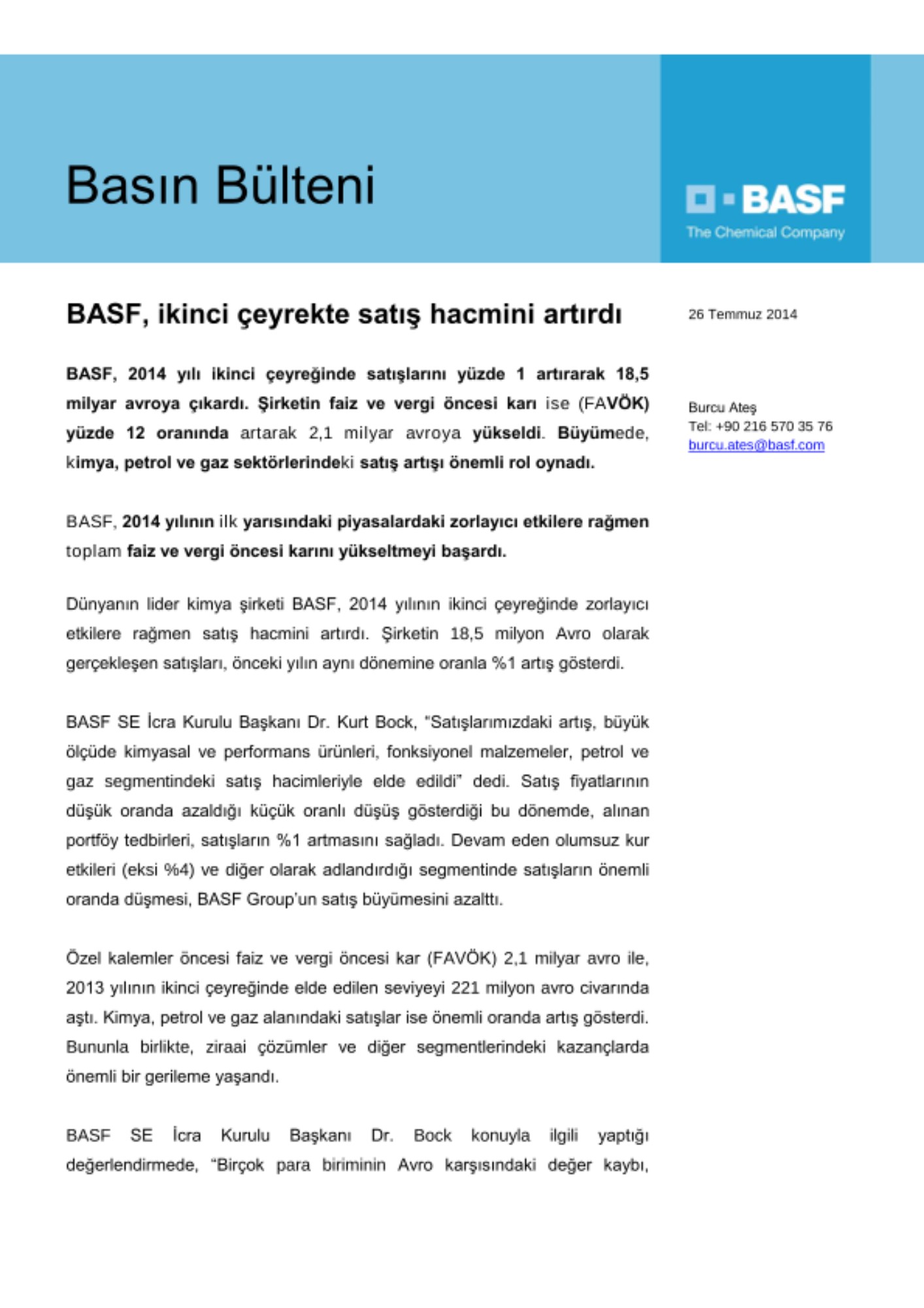 Dünyanın lider kimya şirketi BASF, 2014 yılının ikinci çeyreğinde zorlayıcı etkilere rağmen satış hacmini artırdı. Şirketin 18,5 milyon Avro olarak gerçekleşen satışları, önceki yılın aynı dönemine oranla %1 artış gösterdi.