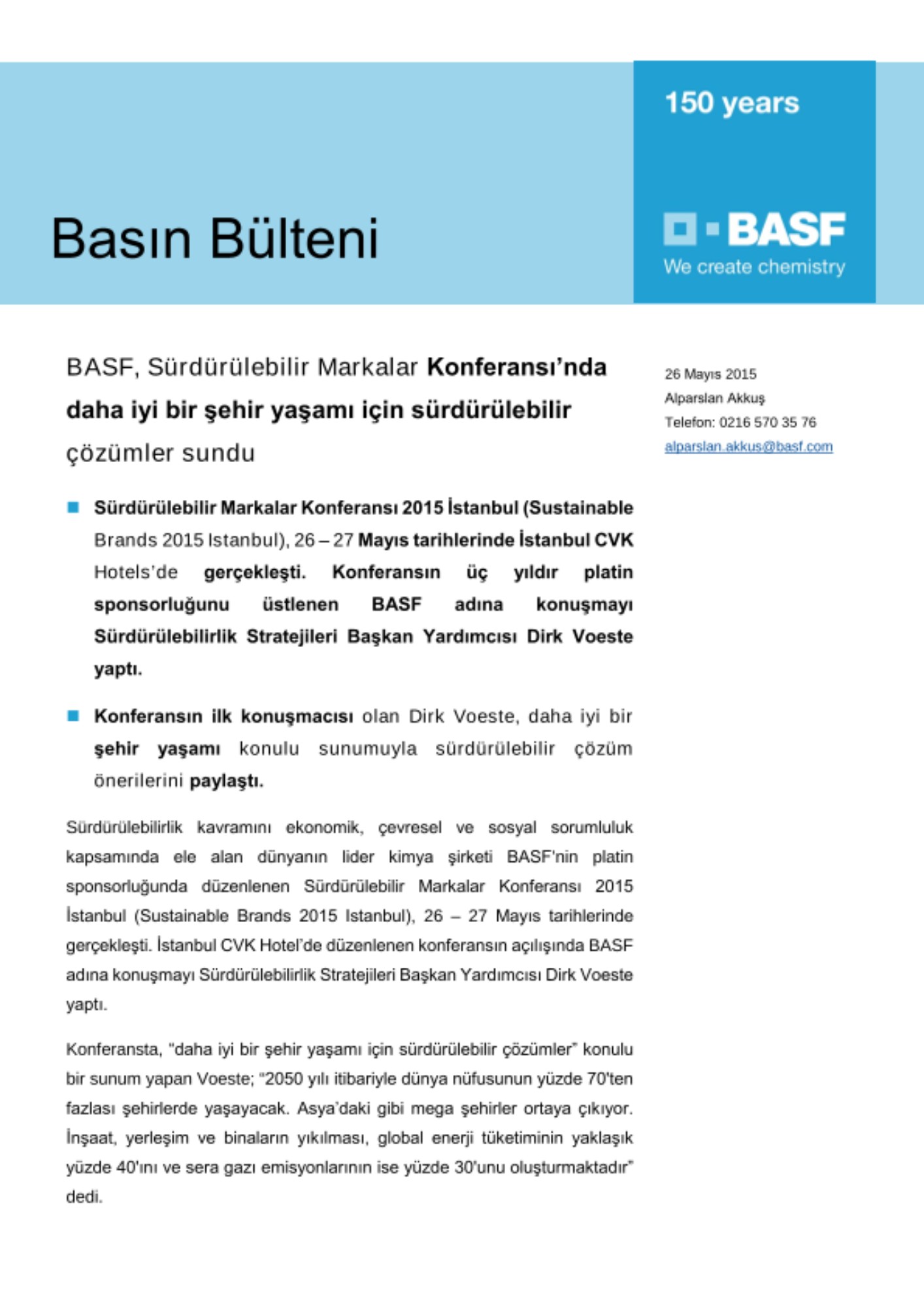 - Sürdürülebilir Markalar Konferansı 2015 İstanbul (Sustainable Brands 2015 Istanbul), 26 – 27 Mayıs tarihlerinde İstanbul CVK Hotels’de gerçekleşti. Konferansın üç yıldır platin sponsorluğunu üstlenen BASF adına konuşmayı Sürdürülebilirlik Stratejileri Başkan Yardımcısı Dirk Voeste yaptı.