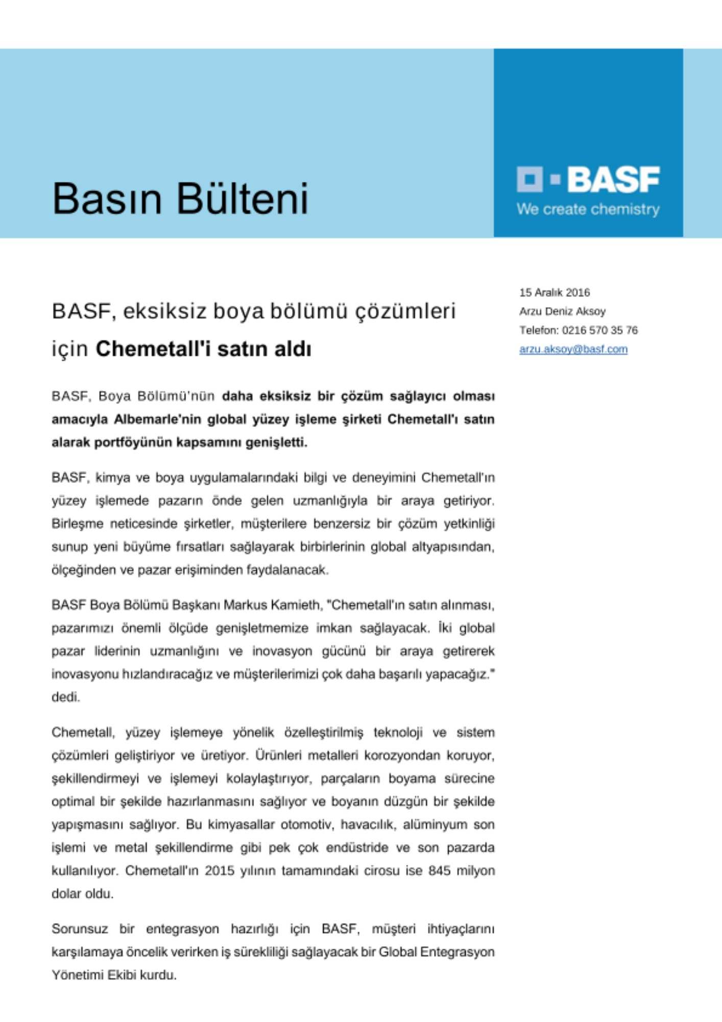 BASF Boya Bölümü Başkanı Markus Kamieth, "Chemetall'ın satın alınması, pazarımızı önemli ölçüde genişletmemize imkan sağlayacak. İki global pazar liderinin uzmanlığını ve inovasyon gücünü bir araya getirerek inovasyonu hızlandıracağız ve müşterilerimizi çok daha başarılı yapacağız." dedi.