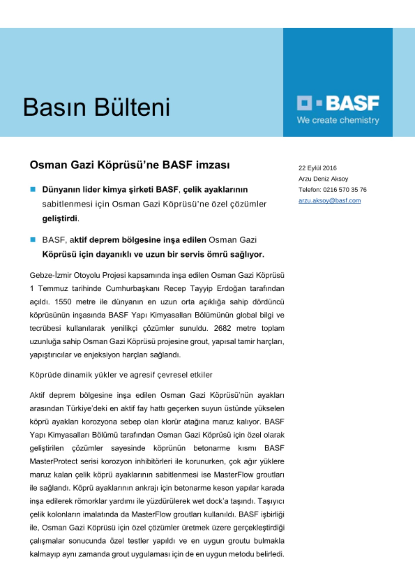 Gebze-İzmir Otoyolu Projesi kapsamında inşa edilen Osman Gazi Köprüsü 1 Temmuz tarihinde Cumhurbaşkanı Recep Tayyip Erdoğan tarafından açıldı. 1550 metre ile dünyanın en uzun orta açıklığa sahip dördüncü köprüsünün inşasında BASF Yapı Kimyasalları Bölümünün global bilgi ve tecrübesi kullanılarak yenilikçi çözümler sunuldu. 2682 metre toplam uzunluğa sahip Osman Gazi Köprüsü projesine grout, yapısal tamir harçları, yapıştırıcılar ve enjeksiyon harçları sağlandı.