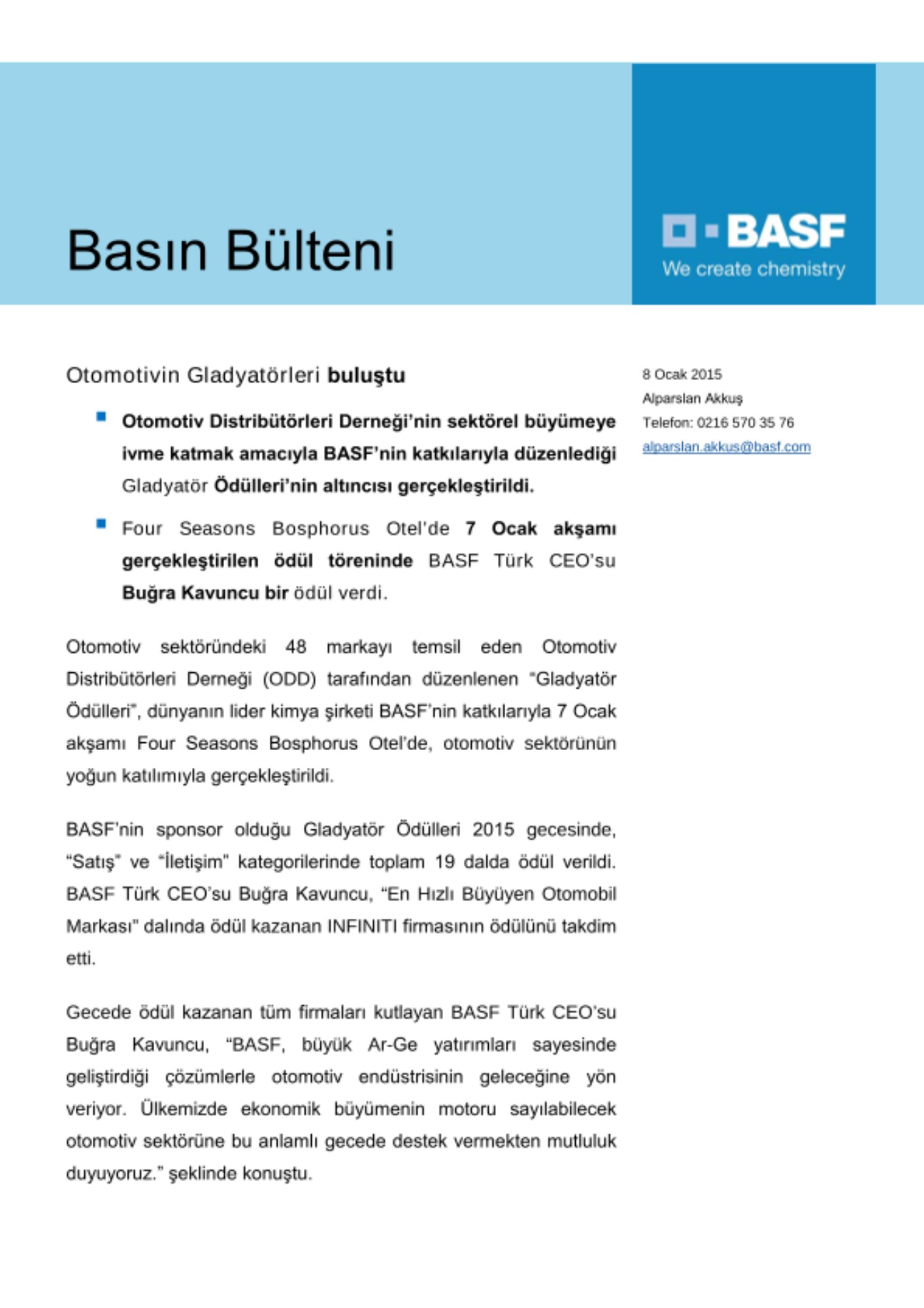 BASF’nin sponsor olduğu Gladyatör Ödülleri 2015 gecesinde, “Satış” ve “İletişim” kategorilerinde toplam 19 dalda ödül verildi. BASF Türk CEO’su Buğra Kavuncu, “En Hızlı Büyüyen Otomobil Markası” dalında ödül kazanan INFINITI firmasının ödülünü takdim etti.