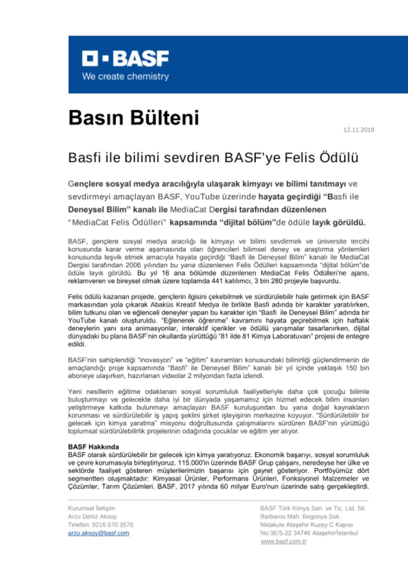 Gençlere sosyal medya aracılığıyla ulaşarak kimyayı ve bilimi tanıtmayı ve sevdirmeyi amaçlayan BASF, YouTube üzerinde hayata geçirdiği “Basfi ile Deneysel Bilim” kanalı ile MediaCat Dergisi tarafından düzenlenen “MediaCat Felis Ödülleri” kapsamında “dijital bölüm”de ödüle layık görüldü.