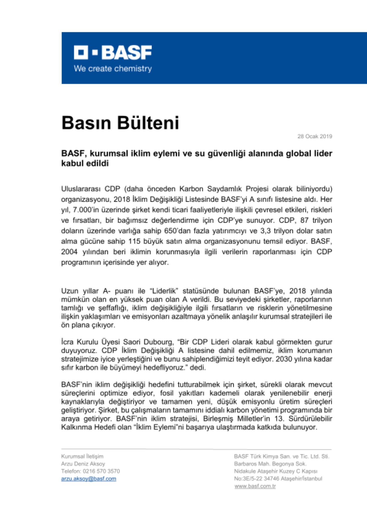 Uzun yıllar A- puanı ile “Liderlik” statüsünde bulunan BASF’ye, 2018 yılında mümkün olan en yüksek puan olan A verildi. Bu seviyedeki şirketler, raporlarının tamlığı ve şeffaflığı, iklim değişikliğiyle ilgili fırsatların ve risklerin yönetilmesine ilişkin yaklaşımları ve emisyonları azaltmaya yönelik anlaşılır kurumsal stratejileri ile ön plana çıkıyor.