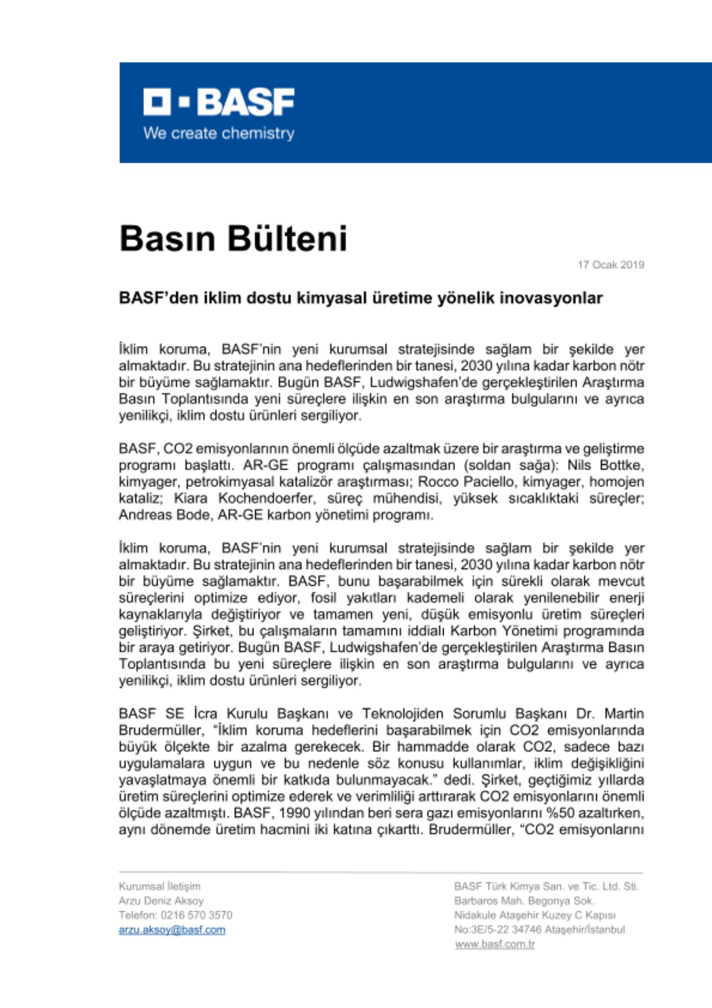 BASF SE İcra Kurulu Başkanı ve Teknolojiden Sorumlu Başkanı Dr. Martin Brudermüller, “İklim koruma hedeflerini başarabilmek için CO2 emisyonlarında büyük ölçekte bir azalma gerekecek. Bir hammadde olarak CO2, sadece bazı uygulamalara uygun ve bu nedenle söz konusu kullanımlar, iklim değişikliğini yavaşlatmaya önemli bir katkıda bulunmayacak.” dedi. Şirket, geçtiğimiz yıllarda üretim süreçlerini optimize ederek ve verimliliği arttırarak CO2 emisyonlarını önemli ölçüde azaltmıştı. BASF, 1990 yılından beri sera gazı emisyonlarını %50 azaltırken, aynı dönemde üretim hacmini iki katına çıkarttı. Brudermüller, “CO2 emisyonlarını daha da fazla azaltmak tamamen yeni teknolojiler geliştirecek. Bu nedenle BASF iddialı bir AR-GE programı başlattı.” dedi.