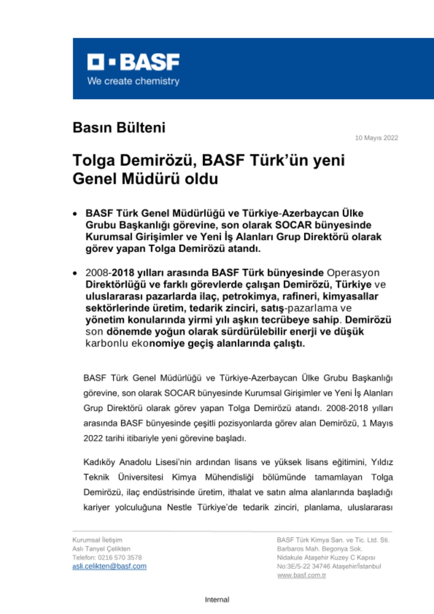 - BASF Türk Genel Müdürlüğü ve Türkiye-Azerbaycan Ülke Grubu Başkanlığı görevine, son olarak SOCAR bünyesinde Kurumsal Girişimler ve Yeni İş Alanları Grup Direktörü olarak görev yapan Tolga Demirözü atandı.