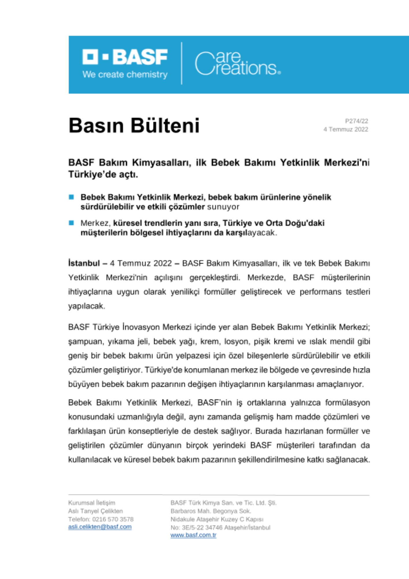 BASF Türkiye İnovasyon Merkezi içinde yer alan Bebek Bakımı Yetkinlik Merkezi; şampuan, yıkama jeli, bebek yağı, krem, losyon, pişik kremi ve ıslak mendil gibi geniş bir bebek bakımı ürün yelpazesi için özel bileşenlerle sürdürülebilir ve etkili çözümler geliştiriyor. Türkiye'de konumlanan merkez ile bölgede ve çevresinde hızla büyüyen bebek bakım pazarının değişen ihtiyaçlarının karşılanması amaçlanıyor.