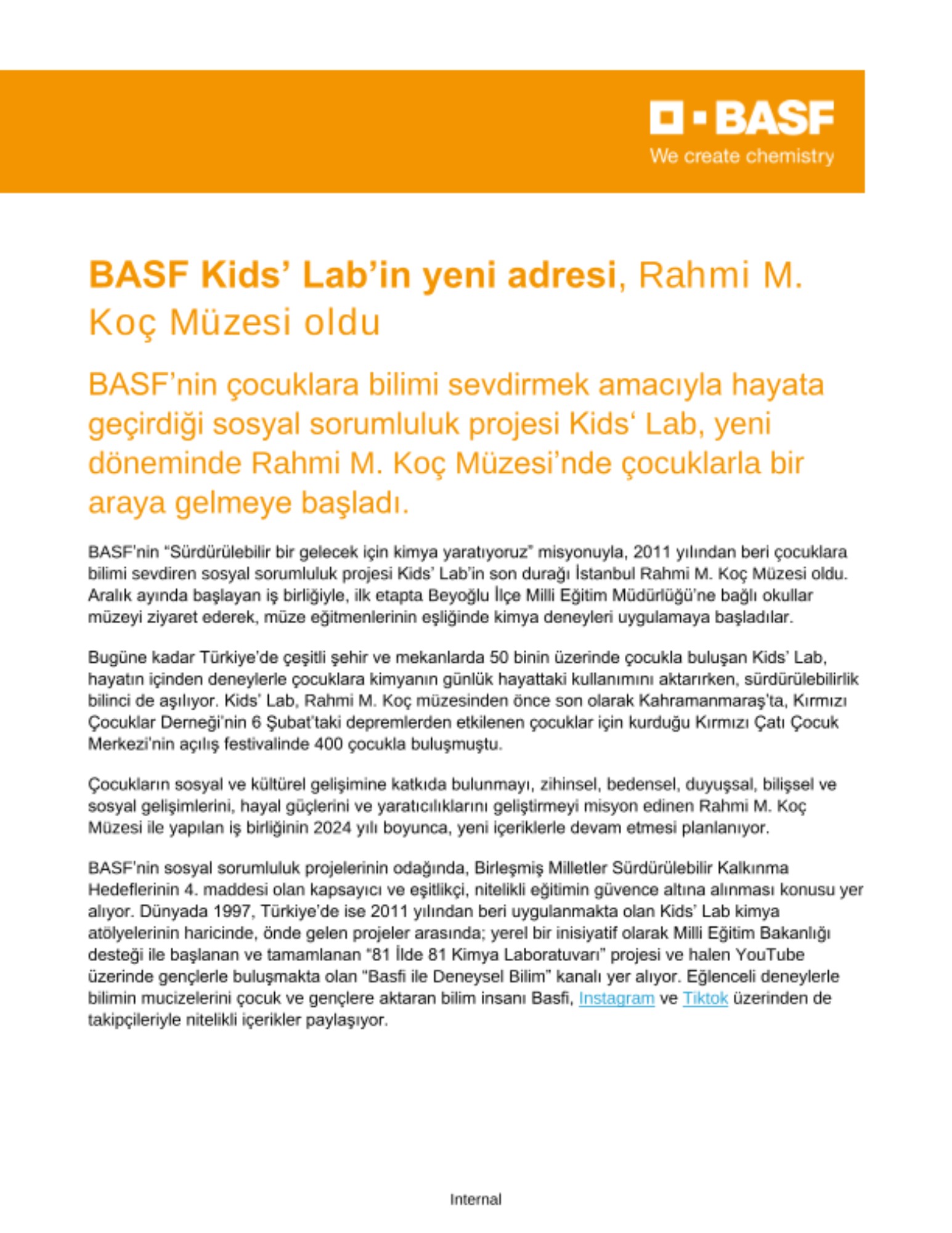 - BASF’nin çocuklara bilimi sevdirmek amacıyla hayata geçirdiği sosyal sorumluluk projesi Kids‘ Lab, yeni döneminde Rahmi M. Koç Müzesi’nde çocuklarla bir araya gelmeye başladı.
