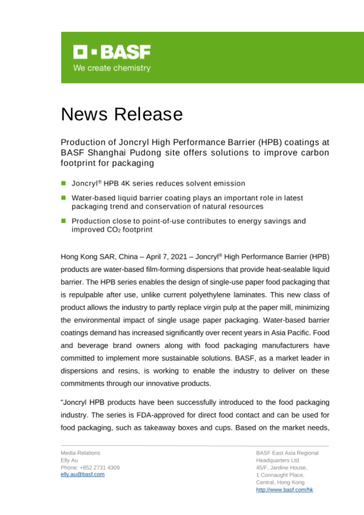 Hong Kong SAR, China – April 7, 2021 – Joncryl High Performance Barrier (HPB) products are water-based film-forming dispersions that provide heat-sealable liquid barrier. The HPB series enables the design of single-use paper food packaging that is repulpable after use, unlike current polyethylene laminates. This new class of product allows the industry to partly replace virgin pulp at the paper mill, minimizing the environmental impact of single usage paper packaging. Water-based barrier coatings demand has increased significantly over recent years in Asia Pacific. Food and beverage brand owners along with food packaging manufacturers have committed to implement more sustainable solutions. BASF, as a market leader in dispersions and resins, is working to enable the industry to deliver on these commitments through our innovative products.