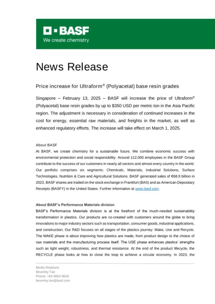 Singapore – February 13, 2025 – BASF will increase the price of Ultraform® (Polyacetal) base resin grades by up to $350 USD per metric ton in the Asia Pacific region. The adjustment is necessary in consideration of continued increases in the cost for energy, essential raw materials, and freights in the market, as well as enhanced regulatory efforts. The increase will take effect on March 1, 2025.