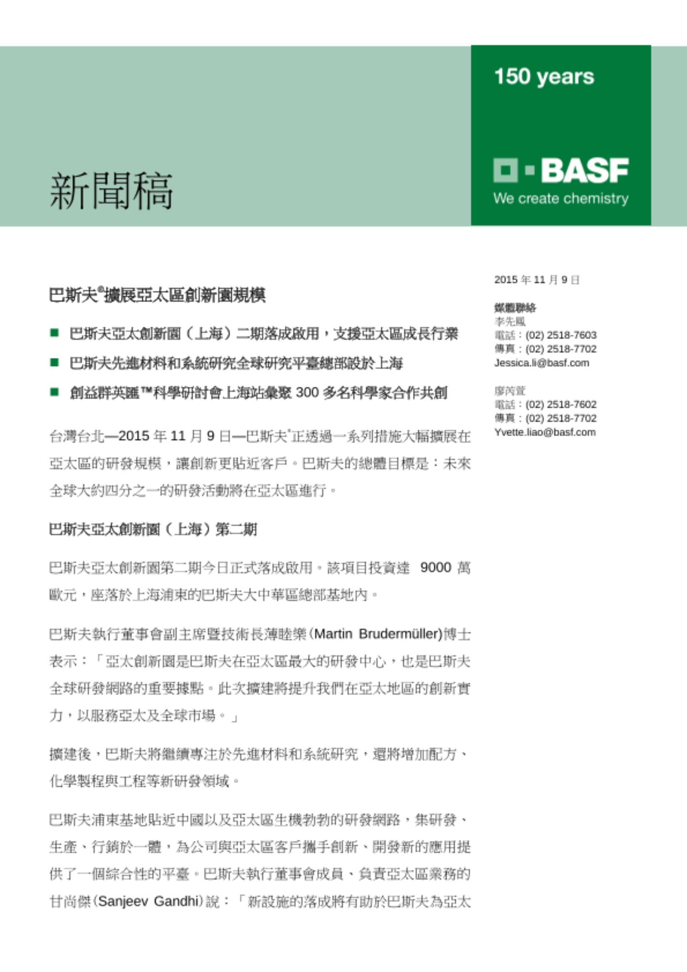 台灣台北—2015 年 11 月 9 日—巴斯夫正透過一系列措施大幅擴展在亞太區的研發規模,讓創新更貼近客戶。巴斯夫的總體目標是:未來全球大約四分之一的研發活動將在亞太區進行。