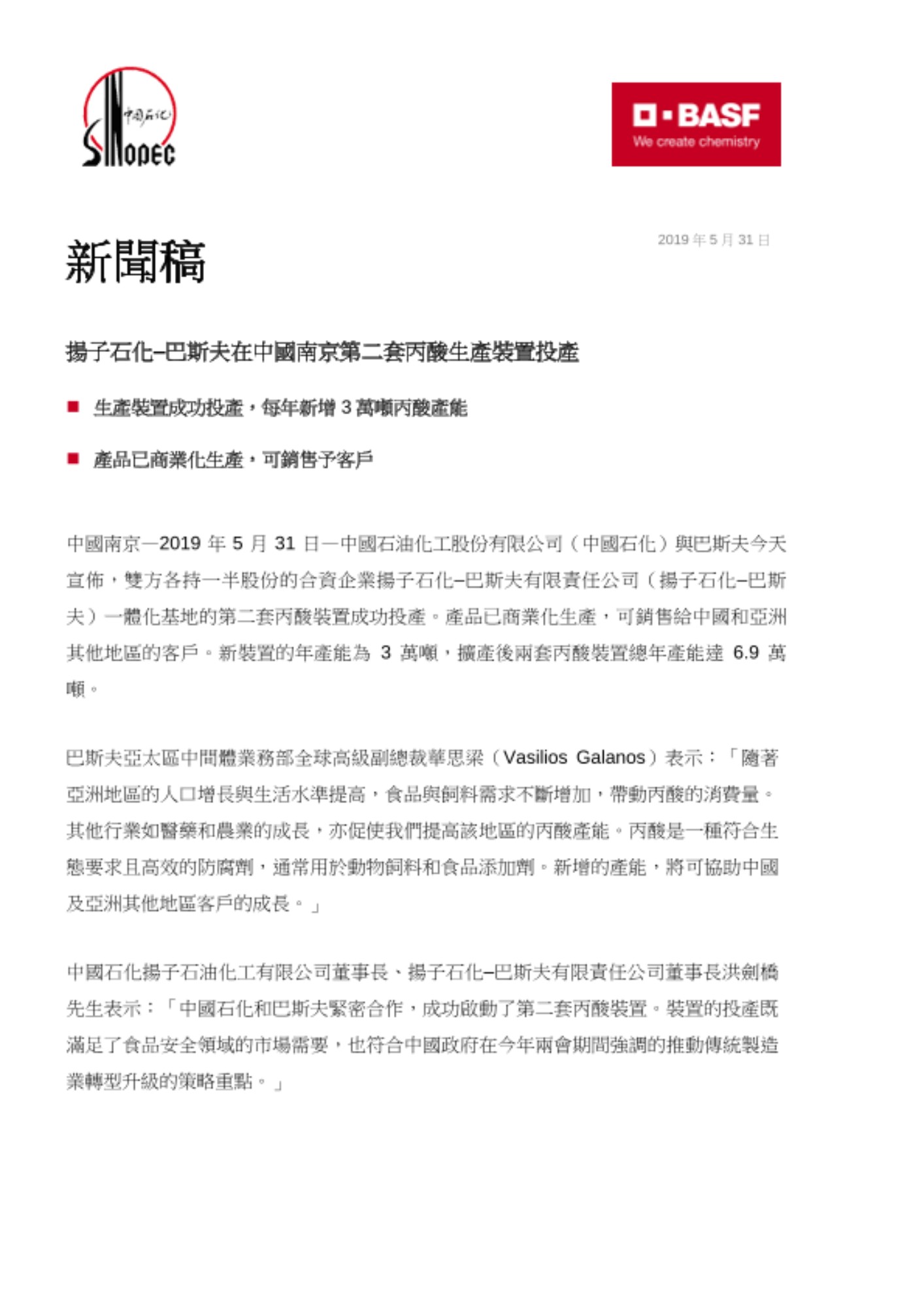 中國南京—2019 年 5 月 31 日—中國石油化工股份有限公司(中國石化)與巴斯夫今天宣佈,雙方各持一半股份的合資企業揚子石化–巴斯夫有限責任公司(揚子石化–巴斯夫)一體化基地的第二套丙酸裝置成功投產。產品已商業化生產,可銷售給中國和亞洲其他地區的客戶。新裝置的年產能為3萬噸,擴產後兩套丙酸裝置總年產能達 6.9萬噸。