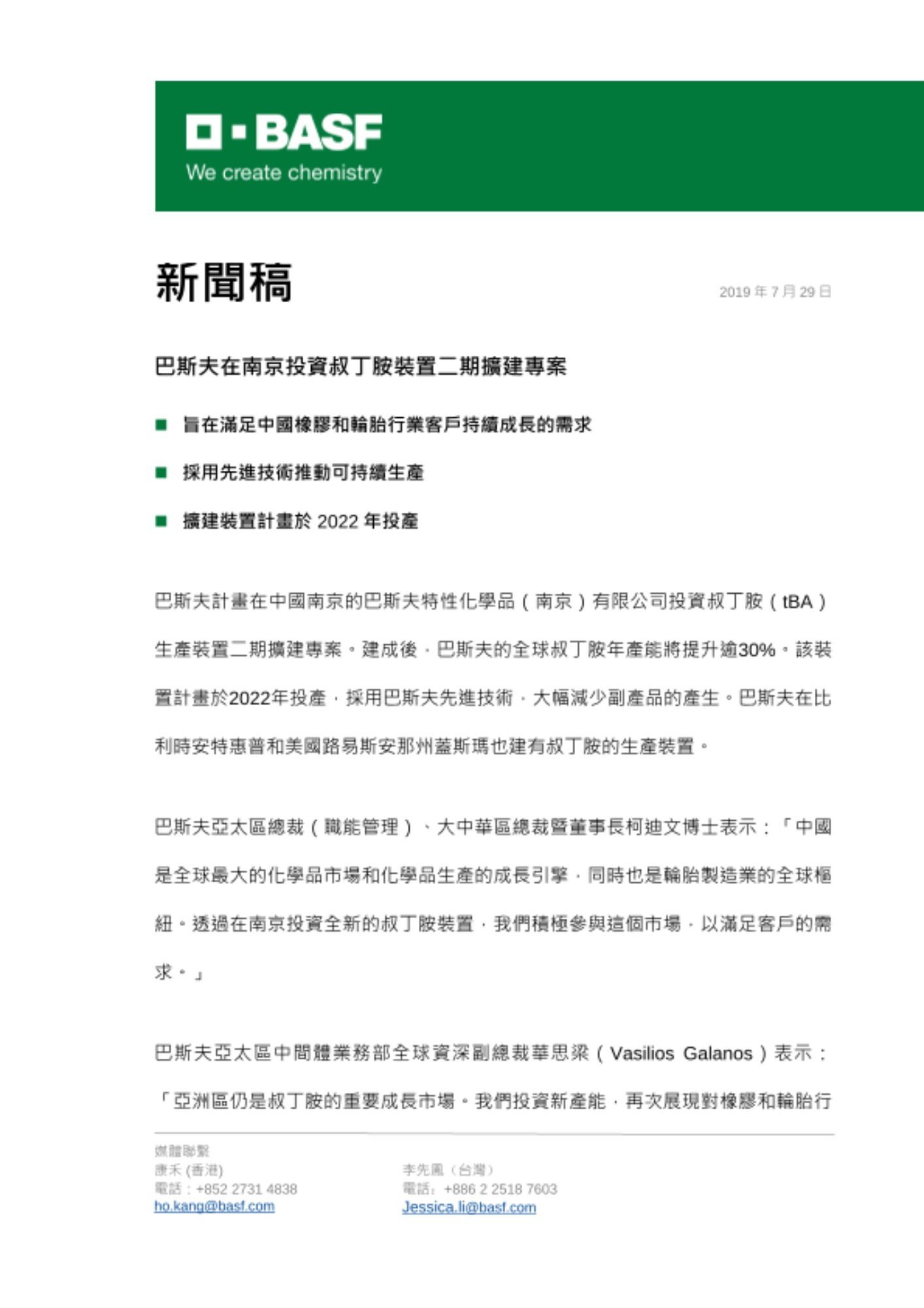 巴斯夫亞太區總裁(職能管理)、大中華區總裁暨董事長柯迪文博士表示:「中國是全球最大的化學品市場和化學品生產的成長引擎,同時也是輪胎製造業的全球樞紐。透過在南京投資全新的叔丁胺裝置,我們積極參與這個市場,以滿足客戶的需求。」