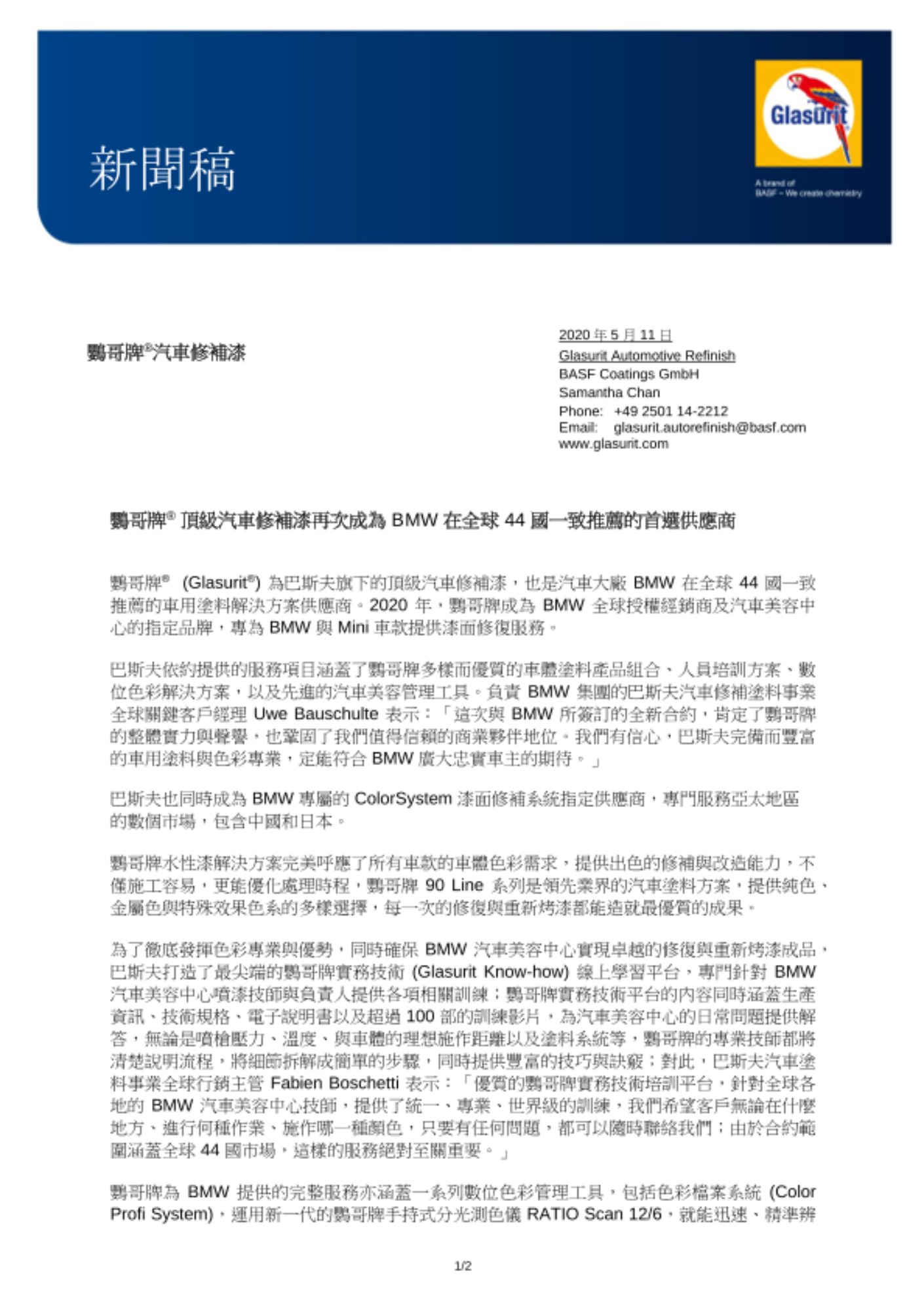 鸚哥牌® ( Glasurit® ) 為巴斯夫旗下的頂級汽車修補漆,也是汽車大廠 BMW 在全球 44 國一致推薦的車用塗料解決方案供應商。2020 年,鸚哥牌成為 BMW 全球授權經銷商及汽車美容中心的指定品牌,專為 BMW 與 Mini 車款提供漆面修復服務。
