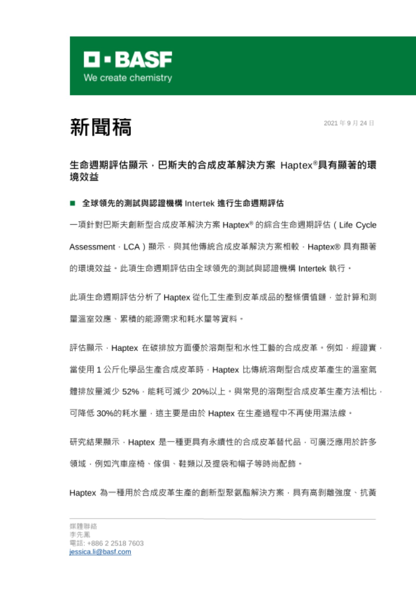 一項針對巴斯夫創新型合成皮革解決方案Haptex® 的綜合生命週期評估(Life Cycle Assessment,LCA)顯示,與其他傳統合成皮革解決方案相較,Haptex® 具有顯著的環境效益。此項生命週期評估由全球領先的測試與認證機構 Intertek 執行。