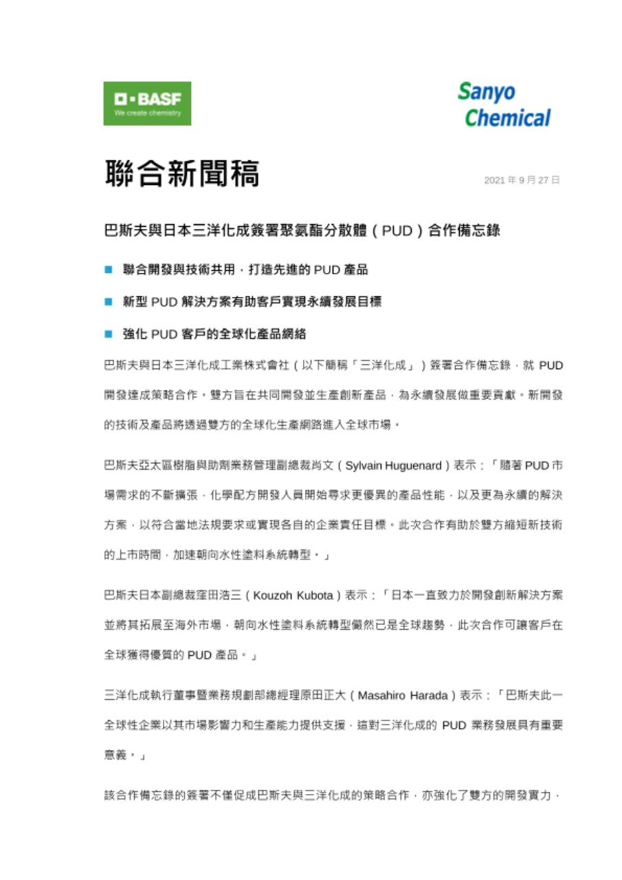 巴斯夫與日本三洋化成工業株式會社(以下簡稱「三洋化成」)簽署合作備忘錄,就 PUD 開發達成策略合作。雙方旨在共同開發並生產創新產品,為永續發展做重要貢獻。新開發的技術及產品將透過雙方的全球化生產網路進入全球市場。