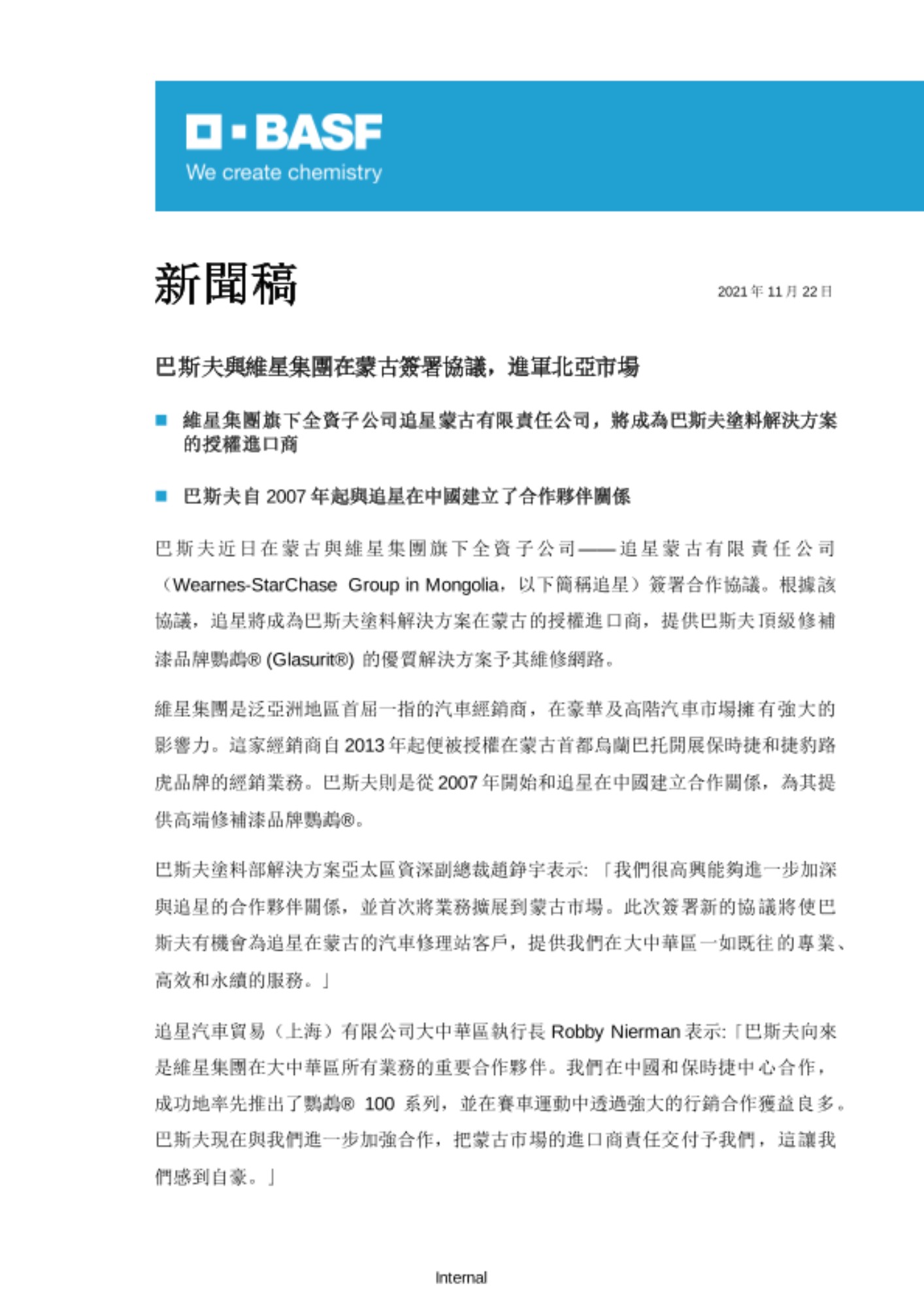 - 維星集團旗下全資子公司追星蒙古有限責任公司,將成為巴斯夫塗料解決方案的授權進口商