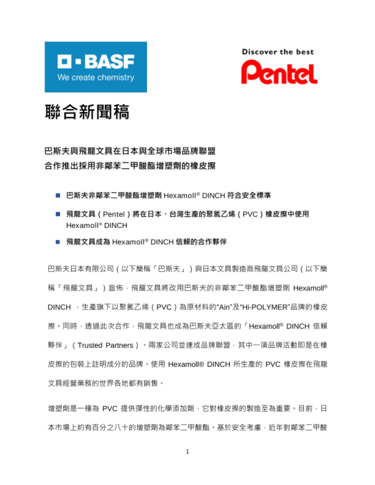 巴斯夫日本有限公司(以下簡稱「巴斯夫」)與日本文具製造商飛龍文具公司(以下簡稱「飛龍文具」)宣佈,飛龍文具將改用巴斯夫的非鄰苯二甲酸酯增塑劑 Hexamoll® DINCH ,生產旗下以聚氯乙烯(PVC)為原材料的 “Ain”及 “Hi-POLYMER”品牌的橡皮擦。同時,透過此次合作,飛龍文具也成為巴斯夫亞太區的「Hexamoll® DINCH 信賴夥伴」(Trusted Partners)。兩家公司並達成品牌聯盟,其中一項品牌活動即是在橡皮擦的包裝上註明成分的品牌。使用 Hexamoll® DINCH 所生產的 PVC 橡皮擦在飛龍文具經營業務的世界各地都有銷售。