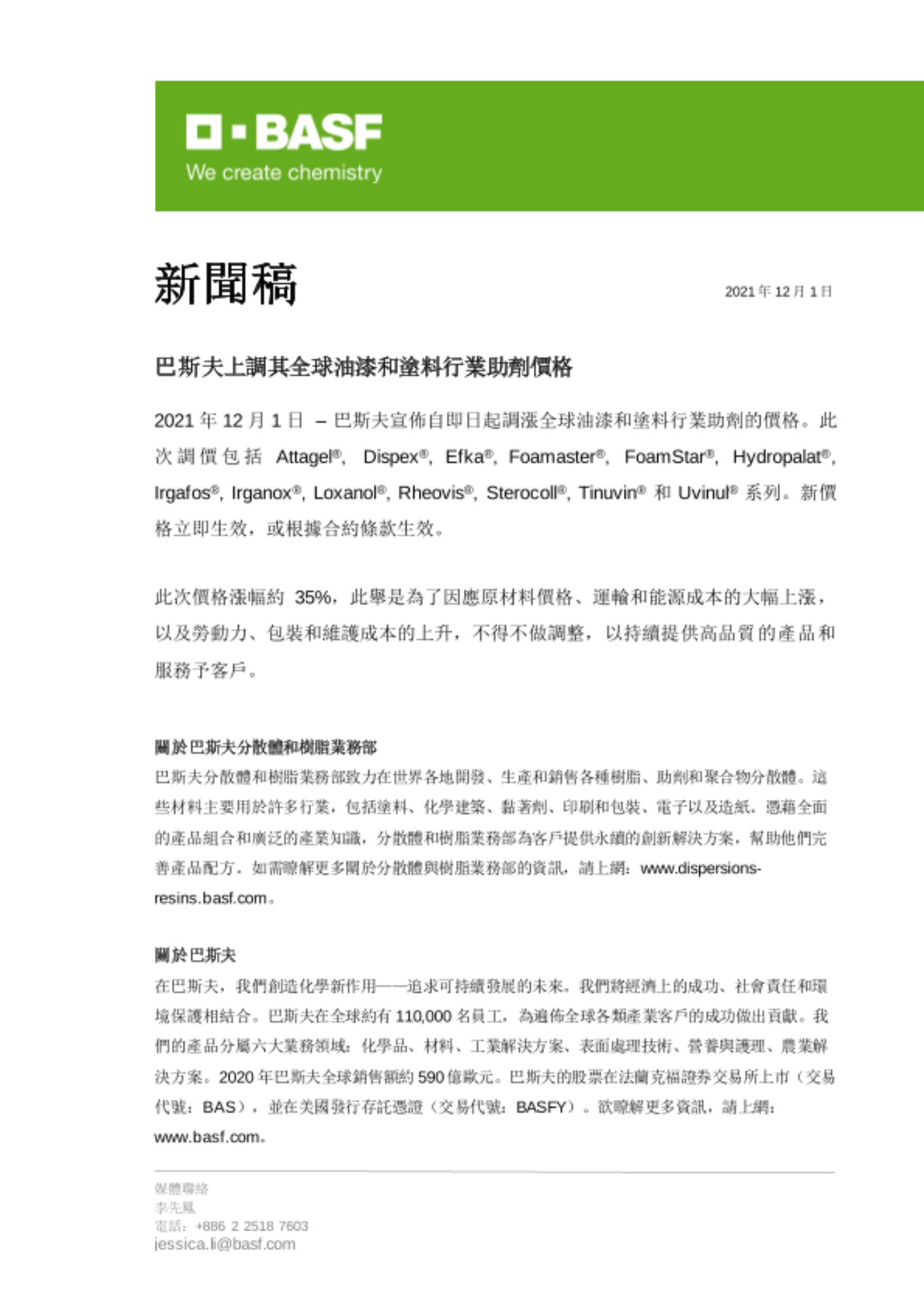 2021年12月1日 – 巴斯夫宣佈自即日起調漲全球油漆和塗料行業助劑的價格。此次調價包括Attagel®, Dispex®, Efka®, Foamaster®, FoamStar®, Hydropalat®, Irgafos®, Irganox®, Loxanol®, Rheovis®, Sterocoll®, Tinuvin® 和 Uvinul® 系列。新價格立即生效,或根據合約條款生效。
