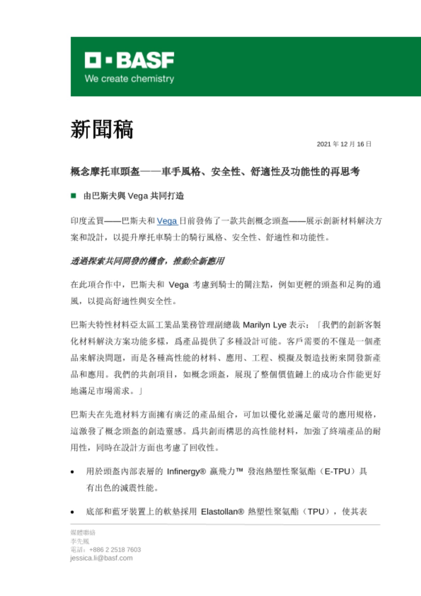 位於貝爾高姆的Vega 汽車配件有限公司研發總監Uttam Chandak表示:「Vega 一直以來是衆多自行車和兩輪車騎士的首選,30 多年來爲他們提供安全與品質保障。我們很高興透過與巴斯夫的合作,為頭盔行業導入新的概念。透過和巴斯夫的功能與創意設計,我們將探索頭盔技術和材料創新及安全性的新領域,共同向我們的使命邁進。」