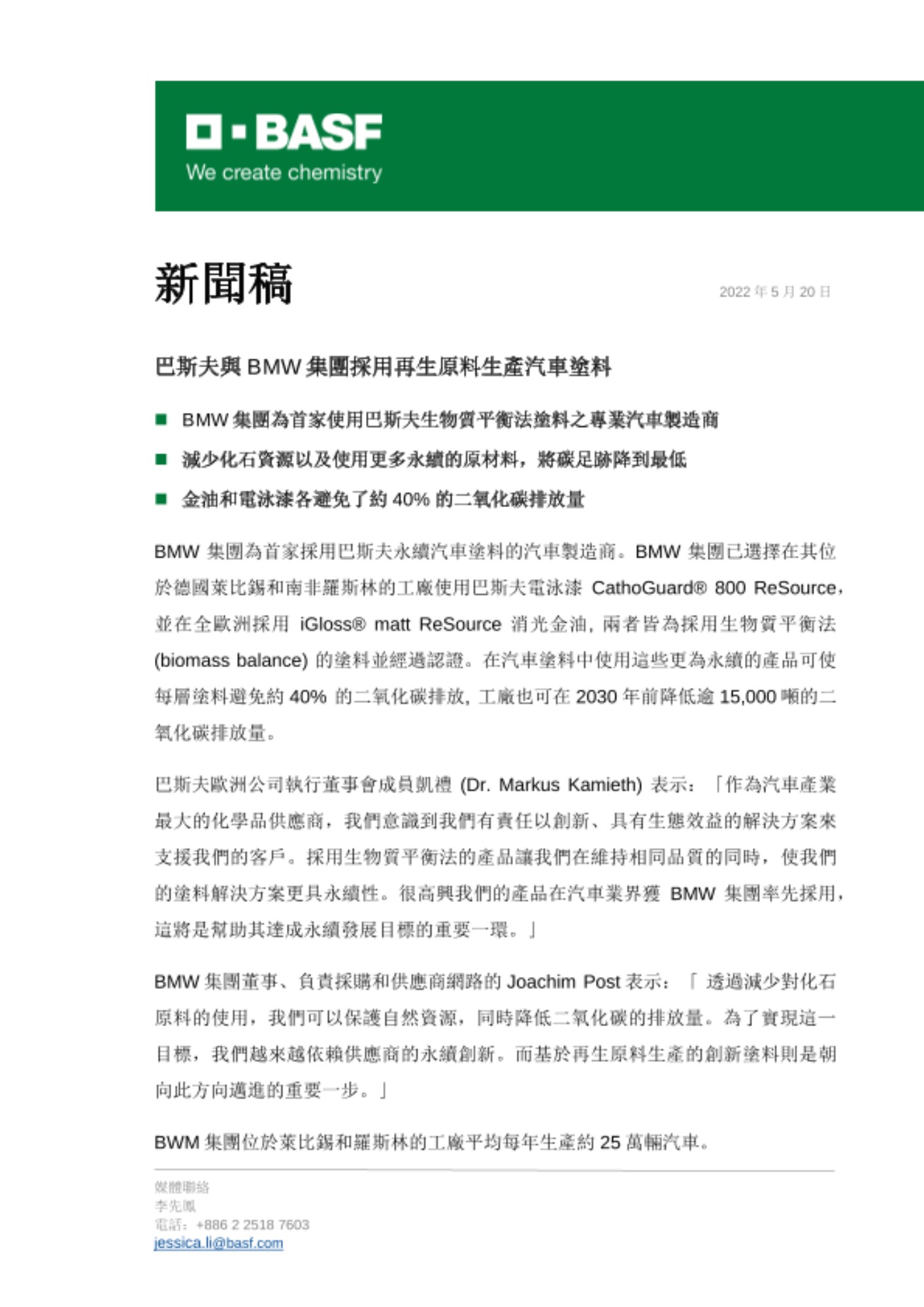 BMW集團為首家採用巴斯夫永續汽車塗料的汽車製造商。BMW集團已選擇在其位於德國萊比錫和南非羅斯林的工廠使用巴斯夫電泳漆CathoGuard® 800 ReSource,並在全歐洲採用iGloss® matt ReSource 消光金油, 兩者皆為採用生物質平衡法(biomass balance) 的塗料並經過認證。在汽車塗料中使用這些更為永續的產品可使每層塗料避免約40% 的二氧化碳排放, 工廠也可在2030年前降低逾15,000噸的二氧化碳排放量。