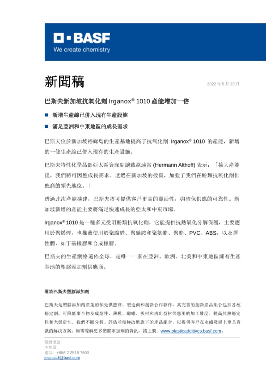 巴斯夫是塑膠添加劑產業的領先供應商、製造商和創新合作夥伴,其完善的創新產品組合包括各種穩定劑,可降低聚合物及成型件、薄膜、纖維、板材和擠出型材等應用的加工難度、提高其熱穩定性和光穩定性。我們不斷分析、評估並積極改進旗下的產品組合,以提供客戶在永續發展上更具貢獻的解決方案。如需瞭解更多塑膠添加劑的資訊,請上網:www.plasticadditives.basf.com。