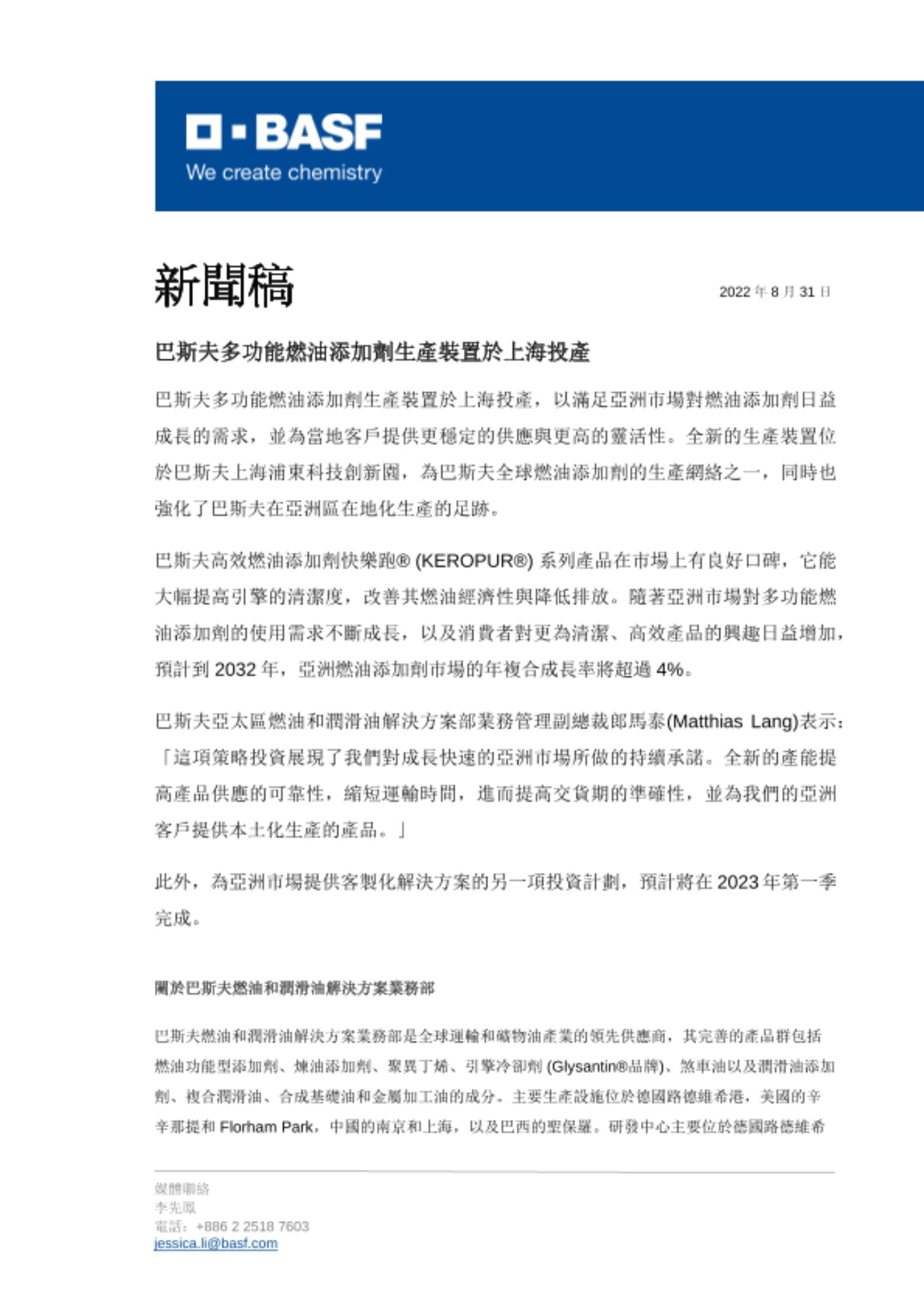 巴斯夫亞太區燃油和潤滑油解決方案部業務管理副總裁郎馬泰(Matthias Lang)表示:「這項策略投資展現了我們對成長快速的亞洲市場所做的持續承諾。全新的產能提高產品供應的可靠性,縮短運輸時間,進而提高交貨期的準確性,並為我們的亞洲客戶提供本土化生產的產品。」
