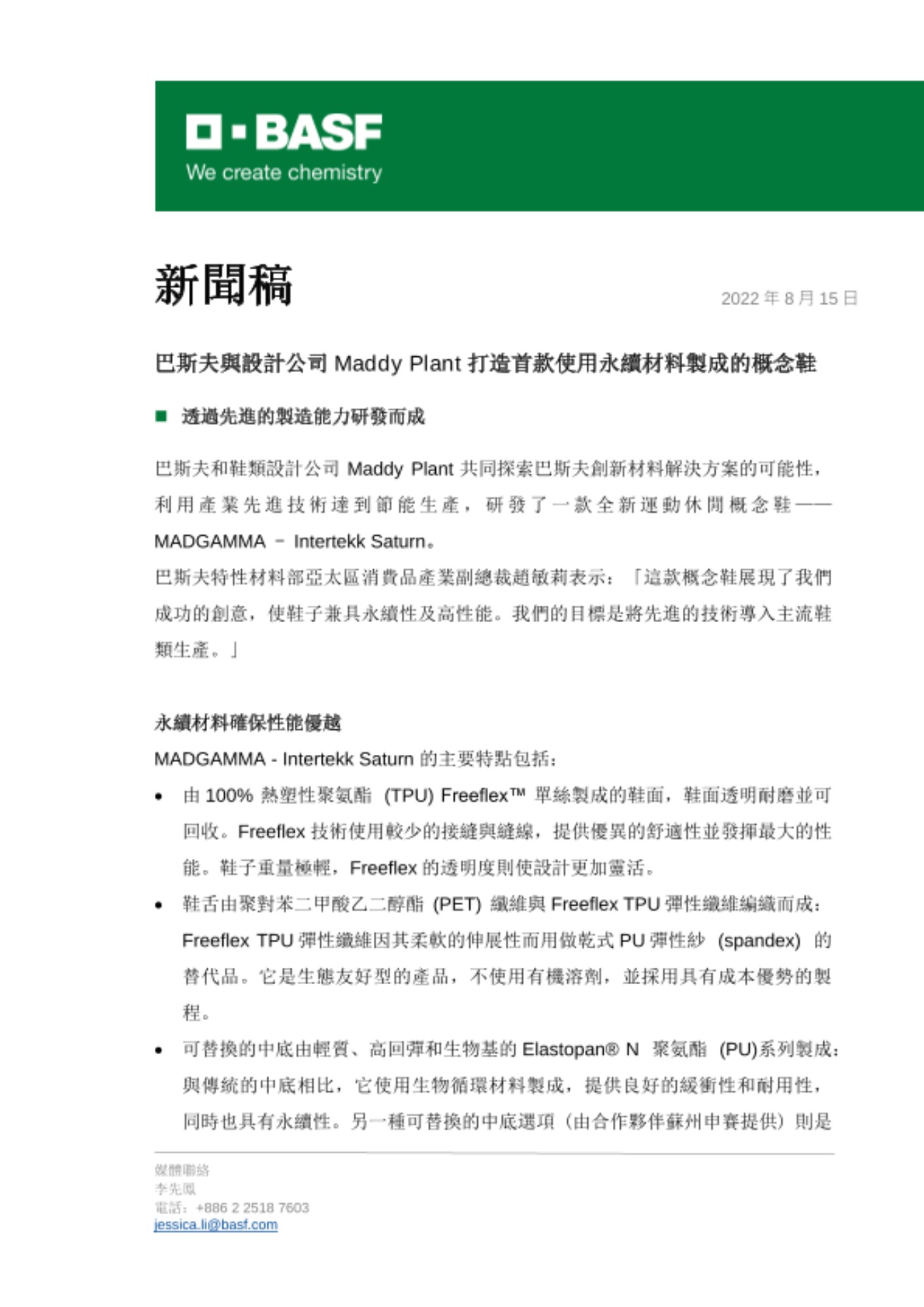 巴斯夫特性材料部亞太區消費品產業副總裁趙敏莉表示:「這款概念鞋展現了我們成功的創意,使鞋子兼具永續性及高性能。我們的目標是將先進的技術導入主流鞋類生產。」