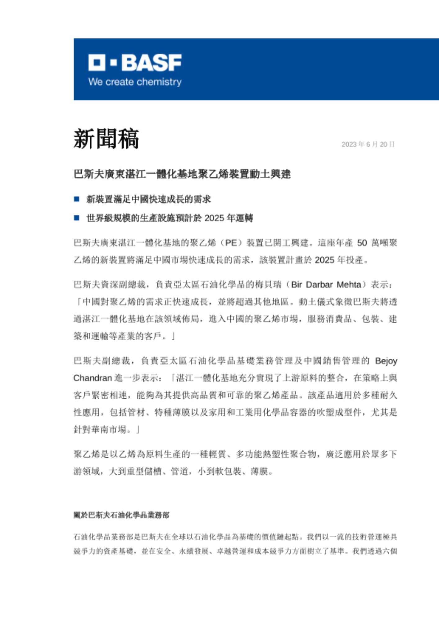 關於巴斯夫石油化學品業務部