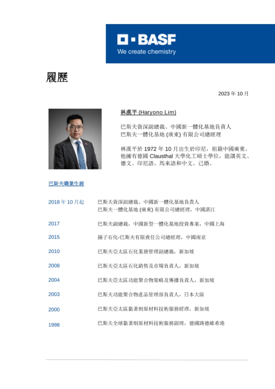 現任巴斯夫資深副總裁、中國新一體化基地負責人兼巴斯夫一體化基地(廣東)有限公司總經理林漢平(Haryono Lim,50歲),將於 2024 年 1 月 1 日起出任巴斯夫亞洲大型項目總裁,工作地點為中國廣東省湛江。