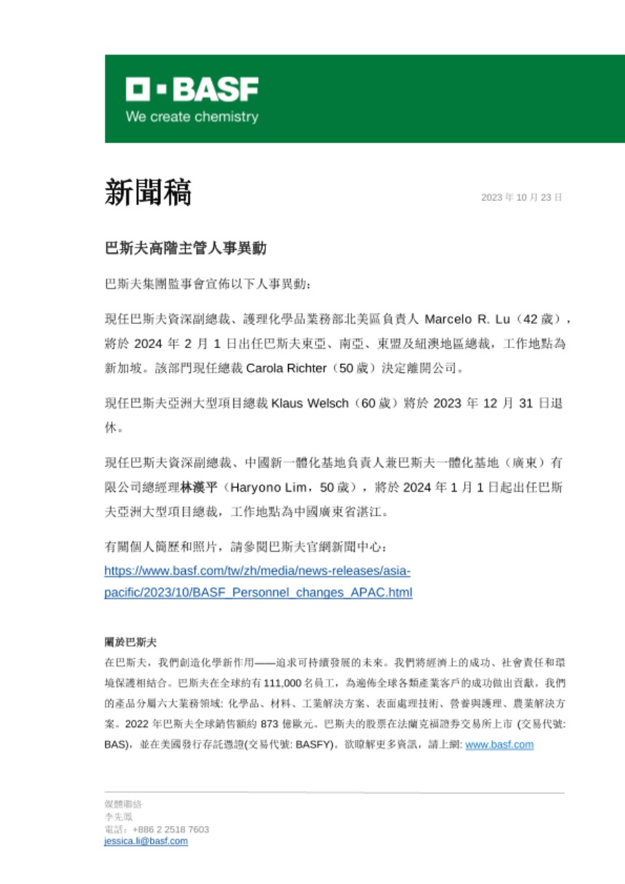 現任巴斯夫資深副總裁、護理化學品業務部北美區負責人 Marcelo R. Lu(42歲),將於 2024 年 2 月 1 日出任巴斯夫東亞、南亞、東盟及紐澳地區總裁,工作地點為新加坡。該部門現任總裁 Carola Richter(50歲)決定離開公司。