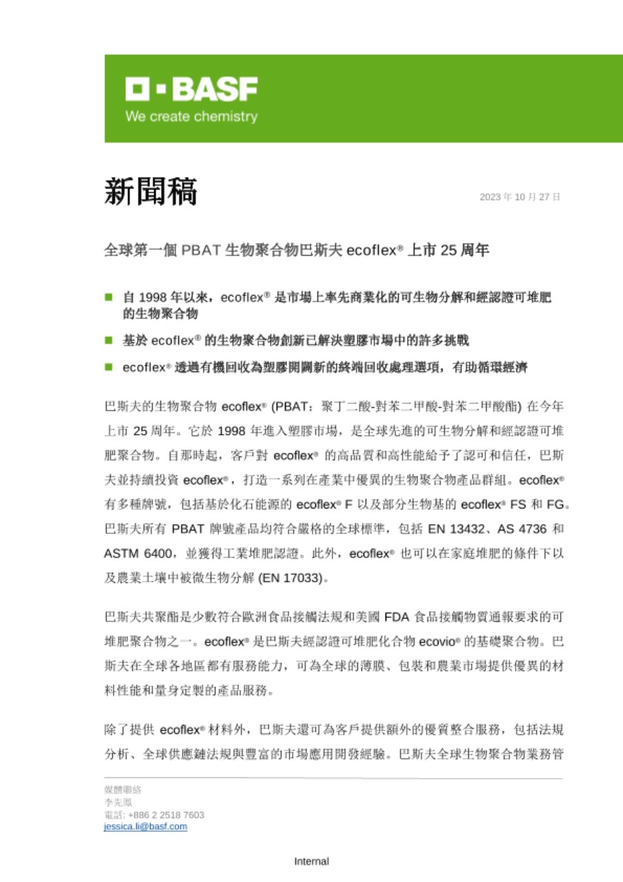 全球第一個 PBAT 生物聚合物巴斯夫 ecoflex® 上市 25 周年
