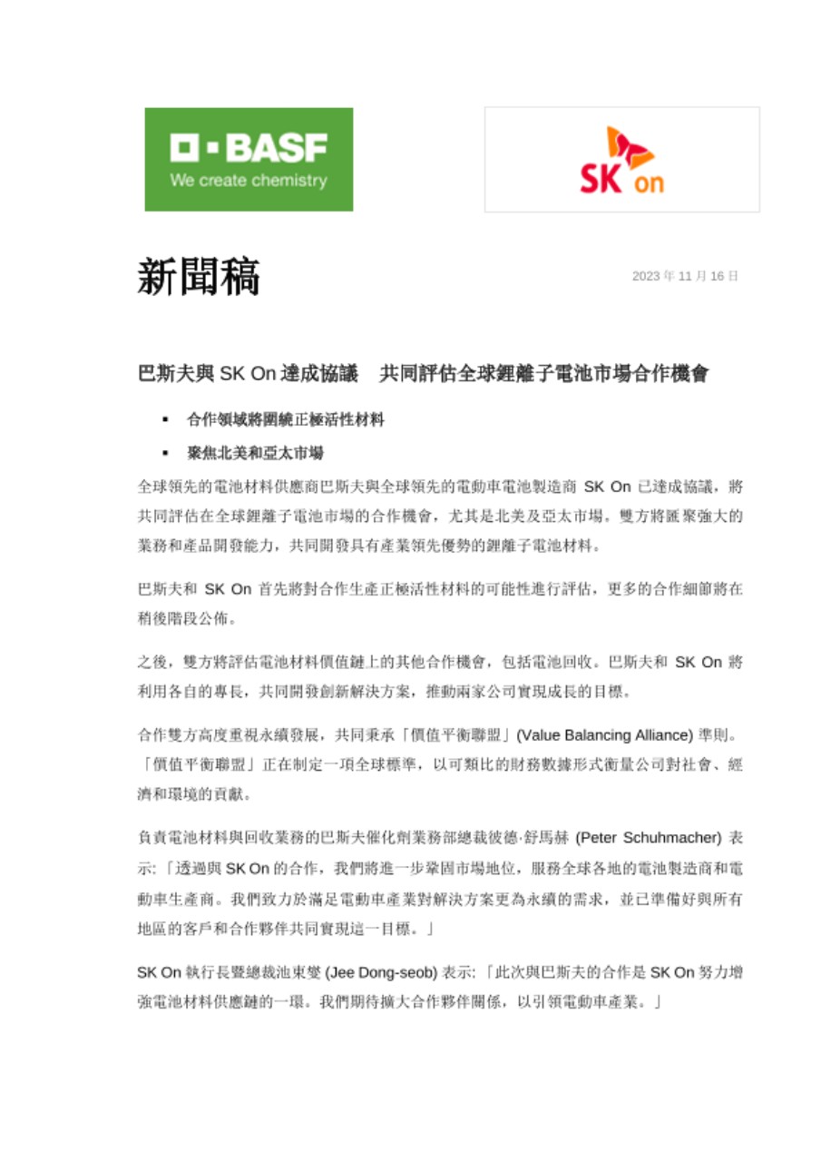 全球領先的電池材料供應商巴斯夫與全球領先的電動車電池製造商 SK On 已達成協議,將共同評估在全球鋰離子電池市場的合作機會,尤其是北美及亞太市場。雙方將匯聚強大的業務和產品開發能力,共同開發具有產業領先優勢的鋰離子電池材料。