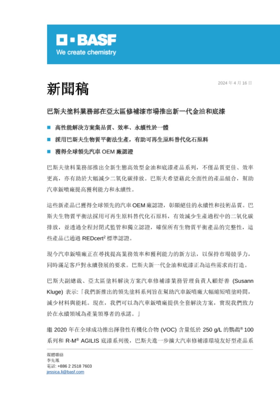 巴斯夫塗料——創新方案,超乎想像。如欲瞭解更多巴斯夫塗料業務部及其產品資訊,請上網: www.basf-coatings.com