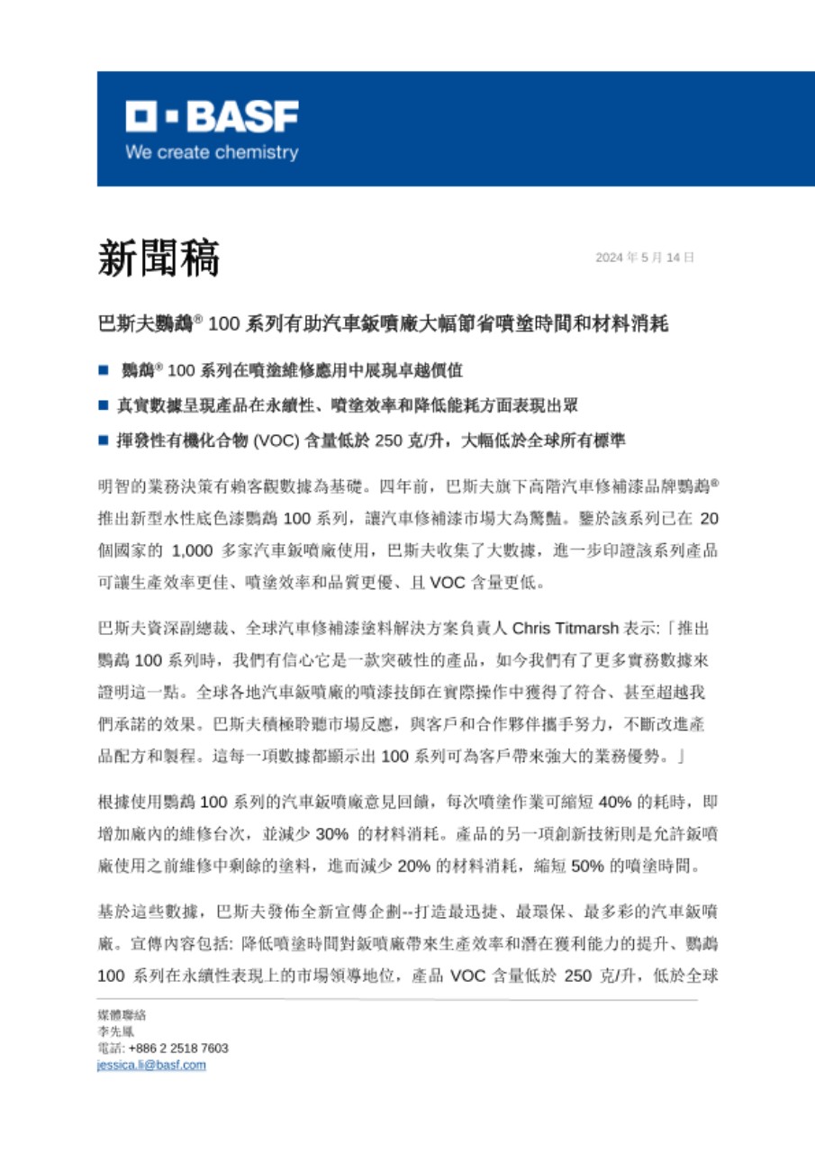 巴斯夫資深副總裁、全球汽車修補漆塗料解決方案負責人 Chris Titmarsh 表示:「推出鸚鵡 100 系列時,我們有信心它是一款突破性的產品,如今我們有了更多實務數據來證明這一點。全球各地汽車鈑噴廠的噴漆技師在實際操作中獲得了符合、甚至超越我們承諾的效果。巴斯夫積極聆聽市場反應,與客戶和合作夥伴攜手努力,不斷改進產品配方和製程。這每一項數據都顯示出 100 系列可為客戶帶來強大的業務優勢。」