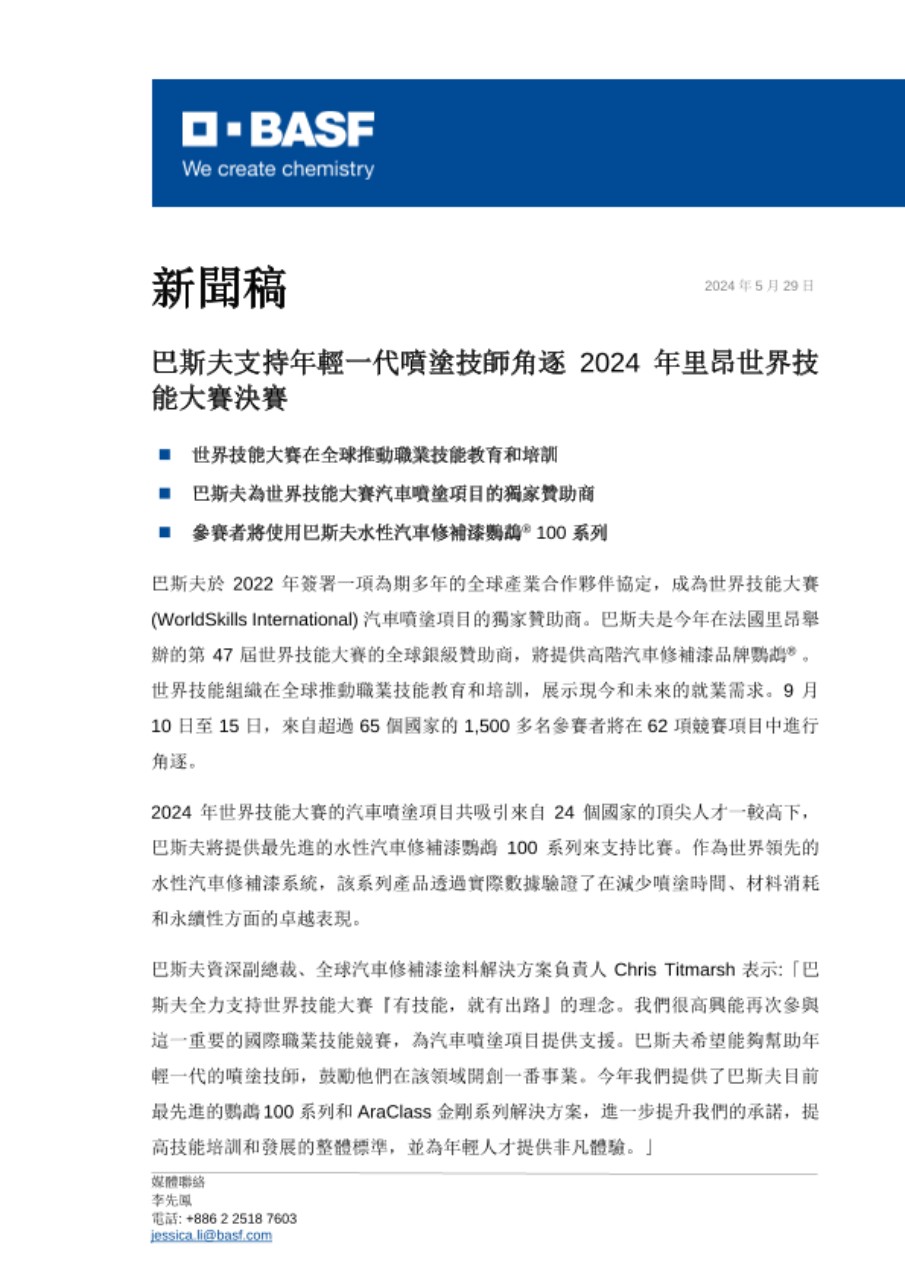 巴斯夫於 2022 年簽署一項為期多年的全球產業合作夥伴協定,成為世界技能大賽 (WorldSkills International) 汽車噴塗項目的獨家贊助商。巴斯夫是今年在法國里昂舉辦的第 47 屆世界技能大賽的全球銀級贊助商,將提供高階汽車修補漆品牌鸚鵡® 。世界技能組織在全球推動職業技能教育和培訓,展示現今和未來的就業需求。9 月 10 日至 15 日,來自超過 65 個國家的 1,500 多名參賽者將在 62 項競賽項目中進行角逐。