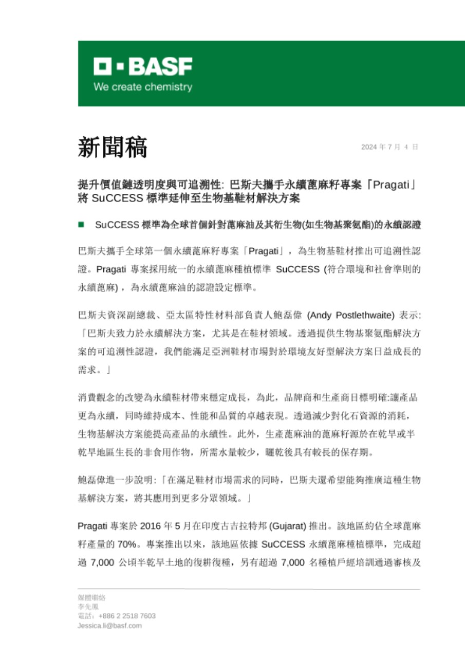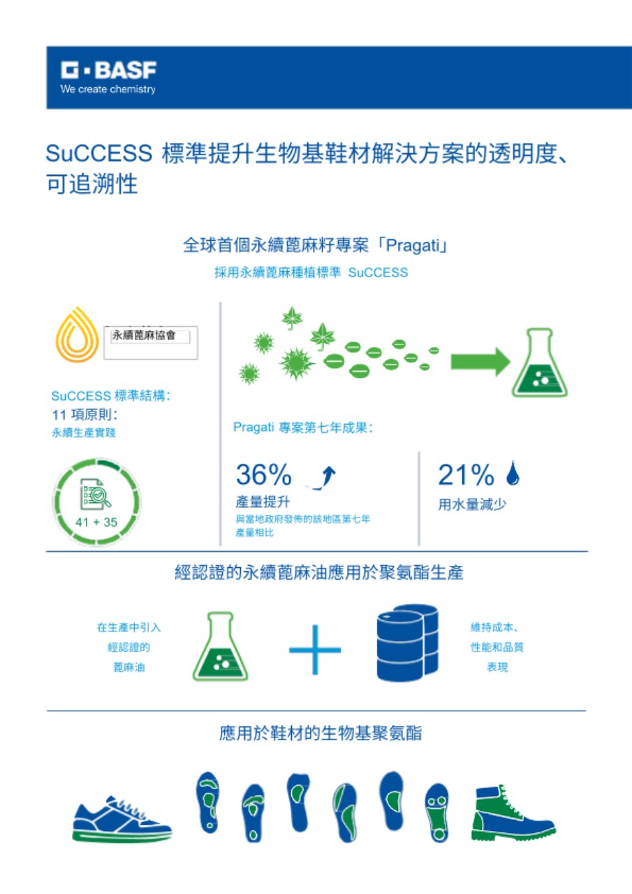 巴斯夫攜手全球第一個永續蓖麻籽專案「Pragati」,為生物基鞋材推出可追溯性認證。Pragati 專案採用統一的永續蓖麻種植標準 SuCCESS (符合環境和社會準則的永續蓖麻) ,為永續蓖麻油的認證設定標準。