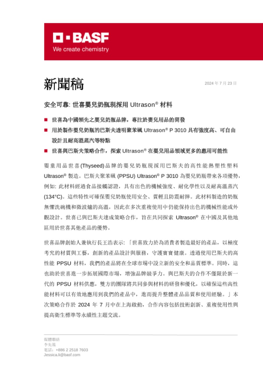 世喜品牌創始人兼執行長王浩表示: 「世喜致力於為消費者製造最好的產品,以極度考究的材質與工藝,創新的產品設計與服務,守護寶寶健康。透過使用巴斯夫的高性能 PPSU 材料,我們的產品將在全球市場中設立新的安全和品質標準。同時,這也助於世喜進一步拓展國際市場,增強品牌競爭力。與巴斯夫的合作不僅限於新一代的 PPSU 材料供應,雙方的團隊將共同參與材料的研發和優化,以確保這些高性能材料可以有效地應用到我們的產品中,進而提升整體產品品質和使用經驗。」本次策略合作於 2024 年 7 月中在上海啟動,合作內容包括技術創新、重複使用性與提高衛生標準等永續性主題交流。