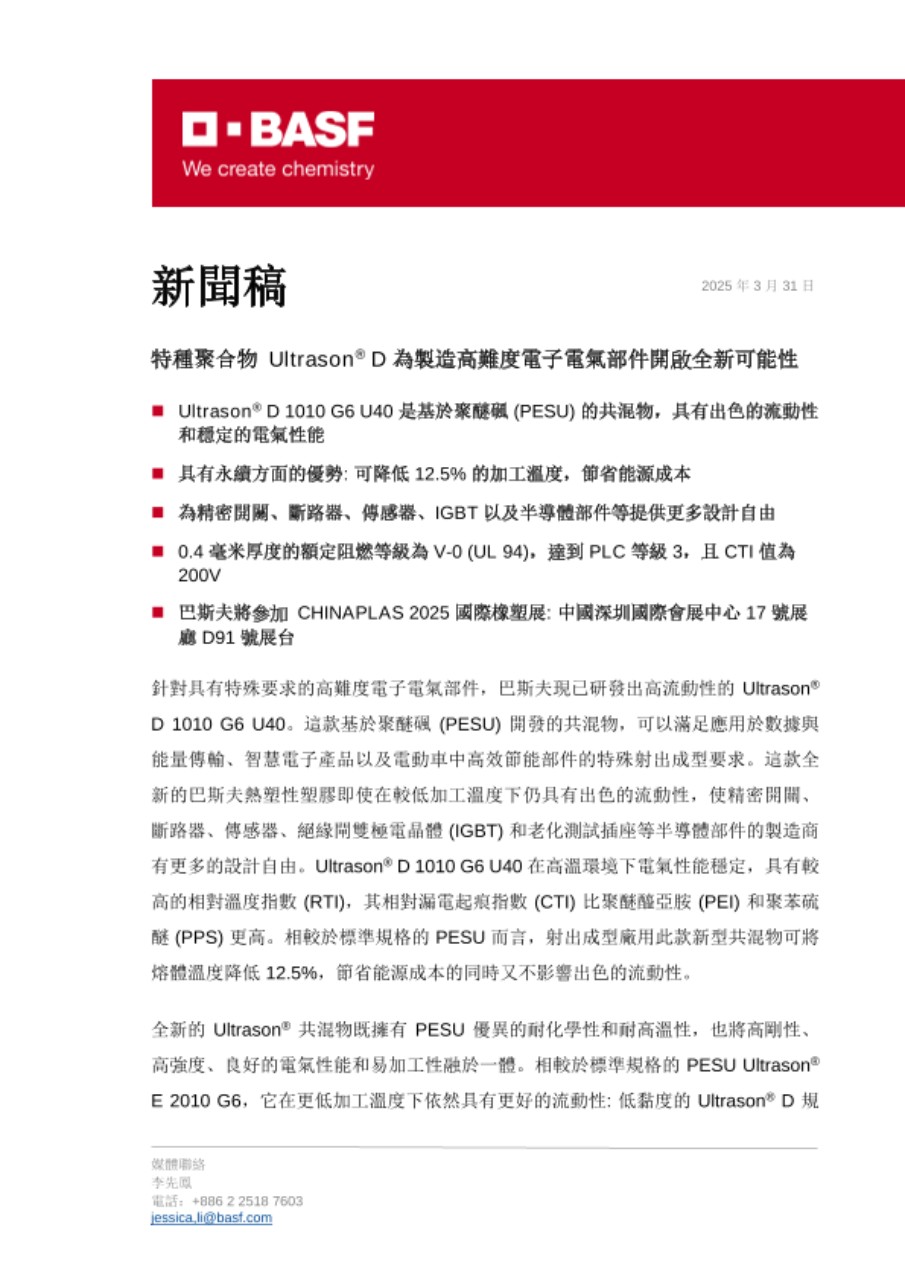巴斯夫 Ultrason® 全球業務發展部的貴田和廣表示:「如果想要開發具有特殊電氣和機械性能要求的高效電子設備,全新推出的 Ultrason® D 是一個明智的選擇。它不僅兼具成熟的聚醚碸產品 Ultrason® E 的卓越性能,同時優化了電子電氣性能,具備出色的流動性,還能實現加工能源的永續利用,這為電動車和消費電子部件開闢了全新可能性。此外,在嚴苛條件下,它也讓更高電壓和更高數據傳輸速率下的應用更為安全。」Ultrason® D 1010 G6 U40 是巴斯夫針對電子電氣產業量身打造的 Ultrason® 產品系列之一: 這些產品可加強現今乃至下一代電子電氣部件的堅固性、耐用性和可靠性,進而推動數位化、大數據和電動車領域的發展。在其他塑膠無法滿足更高性能要求的應用中,這些產品特別適用。