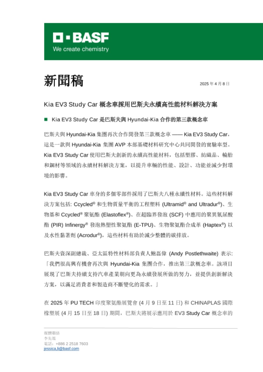 Kia EV3 Study Car 車身的多個零部件採用了巴斯夫八種永續性材料。這些材料解決方案包括: Ccycled® 和生物質量平衡的工程塑料 (Ultramid® and Ultradur®)、生物基和Ccycled® 聚氨酯 (Elastoflex®)、在超臨界發泡 (SCF) 中應用的聚異氰尿酸酯 (PIR) Infinergy® 發泡熱塑性聚氨酯 (E-TPU)、生物聚氨酯合成革 (Haptex®) 以及水性黏著劑 (Acrodur®),這些材料有助於減少整體的碳排放。