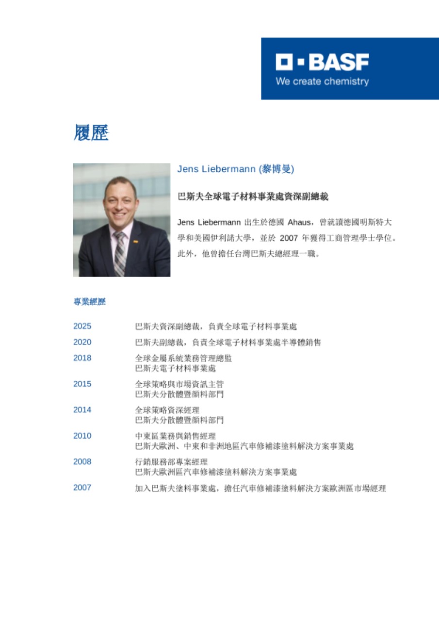 自 2025 年 7 月 1 日起,黎博曼 (Jens Liebermann) 將擔任全球電子材料事業處資深副總裁,領導巴斯夫全球電子材料業務。黎博曼曾任全球電子材料事業處半導體材料全球銷售副總裁暨台灣巴斯夫總經理。在新的職務上,他將運用其在半導體產業的豐富專業知識和成功經驗,確保持續加速策略性客戶的業務發展。黎博曼的領導對於該業務部門的長期成長,尤其是在半導體產業快速發展的環境中,有至關重要的角色。