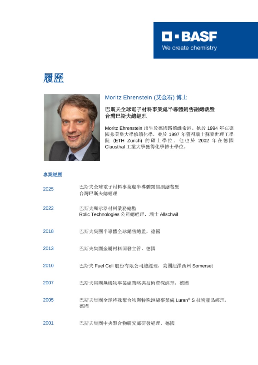 此外,Rolic Technologies 公司總經理、巴斯夫顯示器材料業務負責人艾金石 (Moritz Ehrenstein) 博士將接替黎博曼,擔任巴斯夫全球電子材料事業處半導體銷售副總裁,常駐台灣。艾金石擁有豐富的產業經驗,尤其是在創新技術的研發方面,在管理巴斯夫顯示器材料業務之前,曾負責巴斯夫半導體材料業務的全球銷售管理。