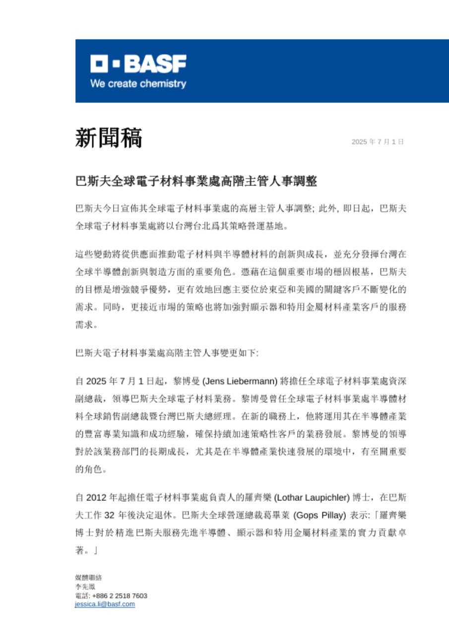 巴斯夫電子材料事業處高階主管人事變更如下: