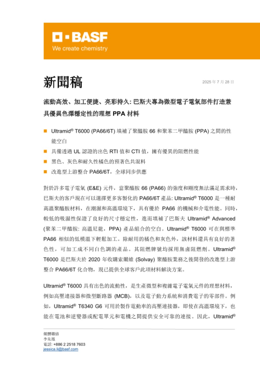 透過將永續發展納入競爭優勢,巴斯夫特性材料業務部引領塑料產業的轉型。我們擁有廣泛的材料專業能力和產品組合,加上深厚的產業知識和洞見,使我們成為理想的一站式供應商; 強大的研發團隊和實力,則持續為全球客戶提供產業領先的技術和專業知識。我們遍佈全球各地,追求卓越創新,貼近客戶,並為在地市場提供客製化的解決方案,以實現我們的競爭優勢。我們致力提高汽車、消費品、工業應用和建築等產業的產品性能和效率。巴斯夫與合作夥伴一起同行 #碳索之路,實現更循環、更為永續的未來。2024 年特性材料業務部全球銷售額達68 億歐元。加入我們的 #碳索之路,請關注「巴斯夫特性材料」官方LinkedIn https://www.linkedin.com/showcase/basf-performance-materials/,訂閱電子報https://on.basf.com/PM_Newsletter 或上網: https://www.performance-materials.basf.com