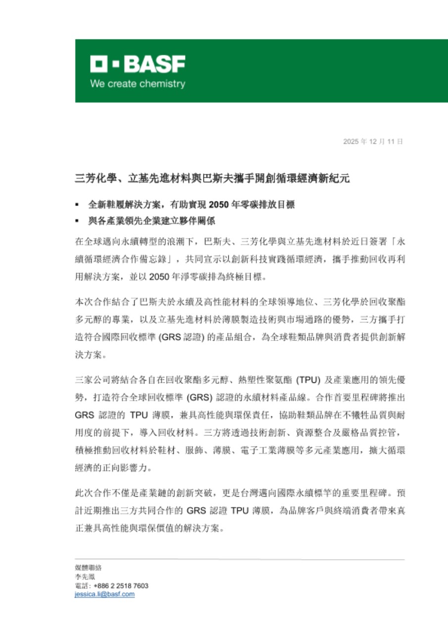 巴斯夫致力於 2050 年實現淨零碳排,三芳化工與立基先進材料則在回收再利用與市場應用領域持續創新。此次策略聯盟不僅展現企業對地球永續的承諾,更以實際行動引領產業邁向低碳、循環、共榮的未來。